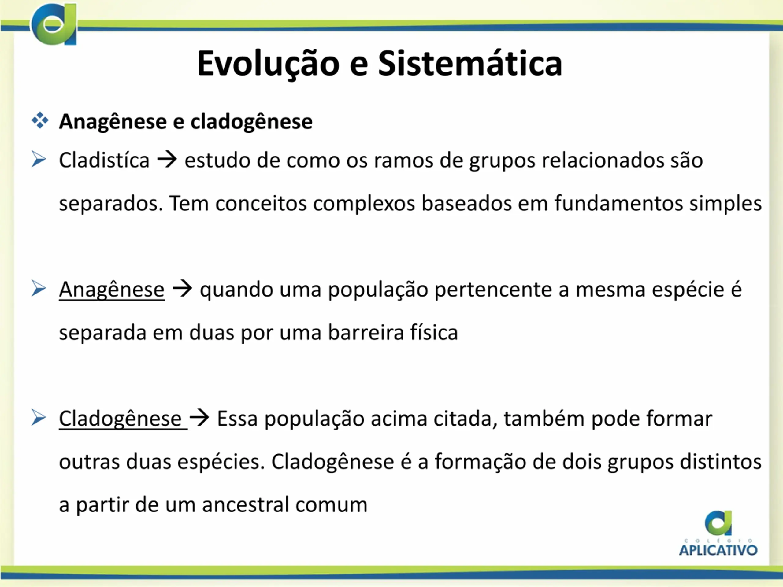 Evoluo e Sistemtica Anag nese e cladog nese Cladist ca estudo de como os ramos de grupos relacionados s o separados. Tem conceitos complexos baseados em fundamentos simples Anag nese quando uma popula o pertencente a mesma esp cie separada em duas por uma barreira f sica Cladog nese Essa popula o acima citada, tamb m pode formar outras duas esp cies. Cladog nese a forma o de dois grupos distintos a partir de um ancestral comum