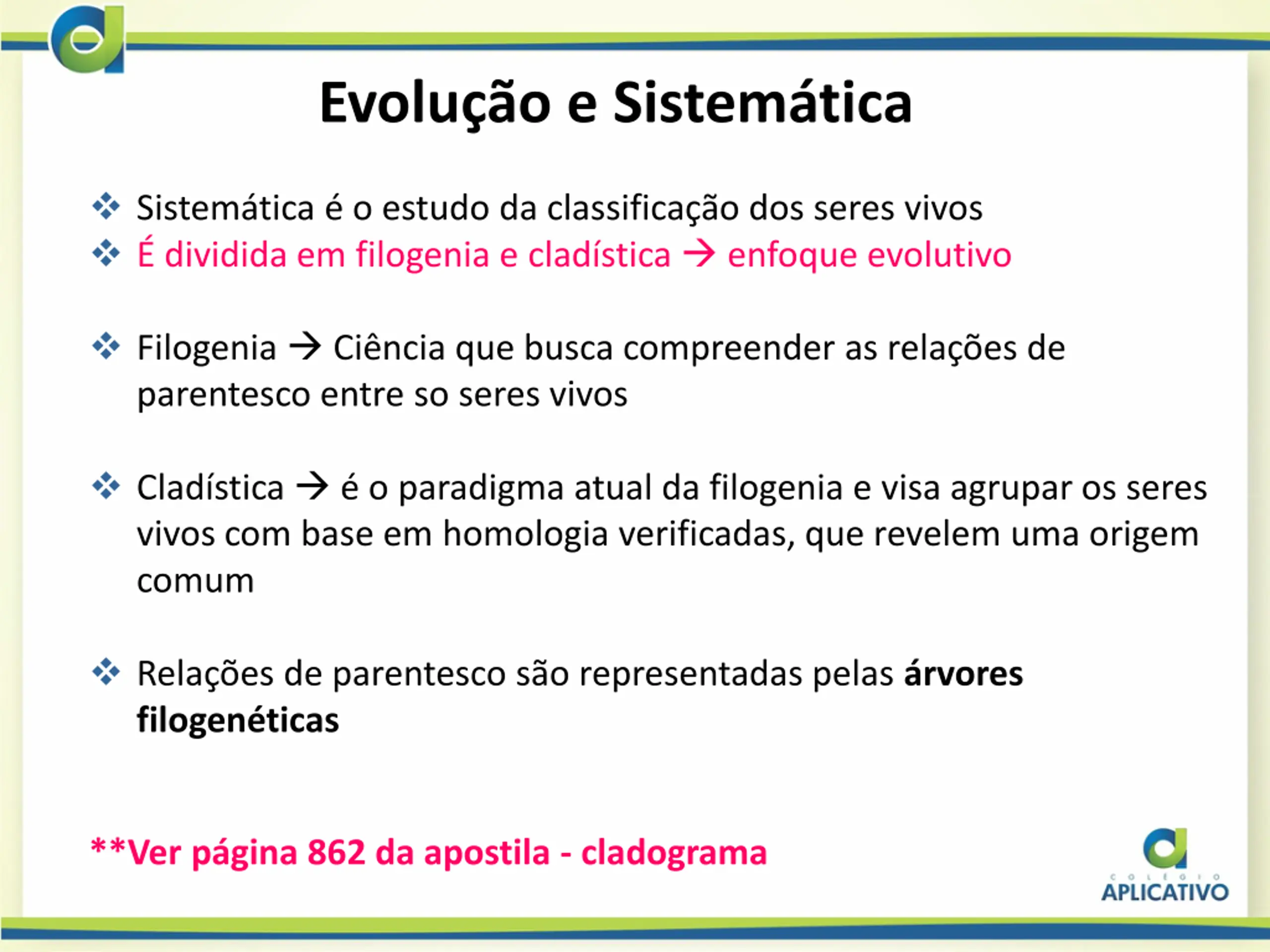 Evoluo e Sistemtica Sistem tica o estudo da classifica o dos seres vivos dividida em filogenia e clad stica enfoque evolutivo Filogenia Ci ncia que busca compreender as rela es de parentesco entre so seres vivos Clad stica o paradigma atual da filogenia e visa agrupar os seres vivos com base em homologia verificadas, que revelem uma origem comum Rela es de parentesco s o representadas pelas rvores filogen ticas **Ver p gina 862 da apostila - cladograma