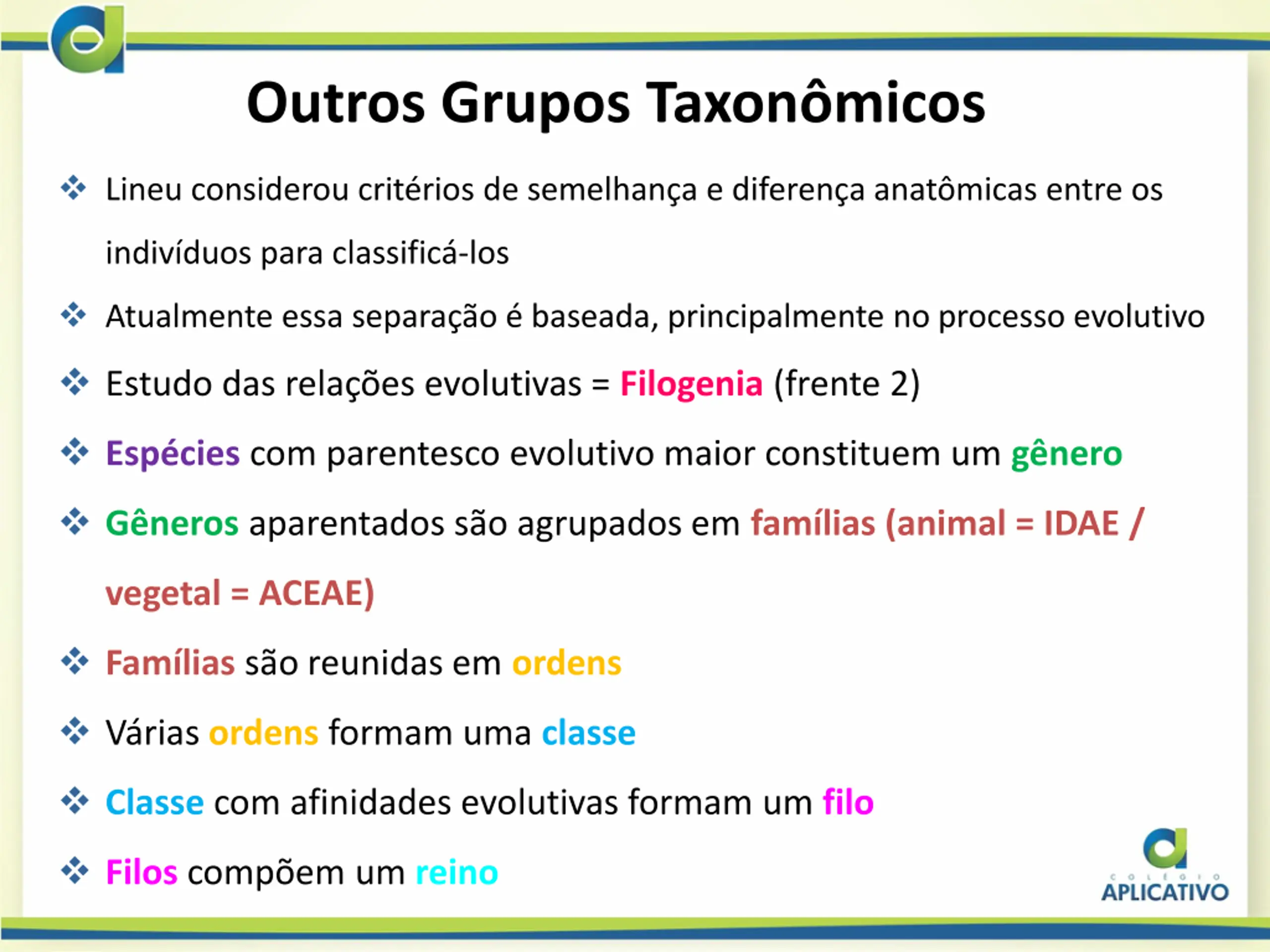 Outros Grupos Taxonmicos Lineu considerou crit rios de semelhan a e diferen a anat micas entre os indiv duos para classific -los Atualmente essa separa o baseada, principalmente no processo evolutivo Estudo das rela es evolutivas = Filogenia (frente 2) Esp cies com parentesco evolutivo maior constituem um g nero G neros aparentados s o agrupados em fam lias (animal = IDAE / vegetal = ACEAE) Fam lias s o reunidas em ordens V rias ordens formam uma classe Classe com afinidades evolutivas formam um filo Filos comp em um reino