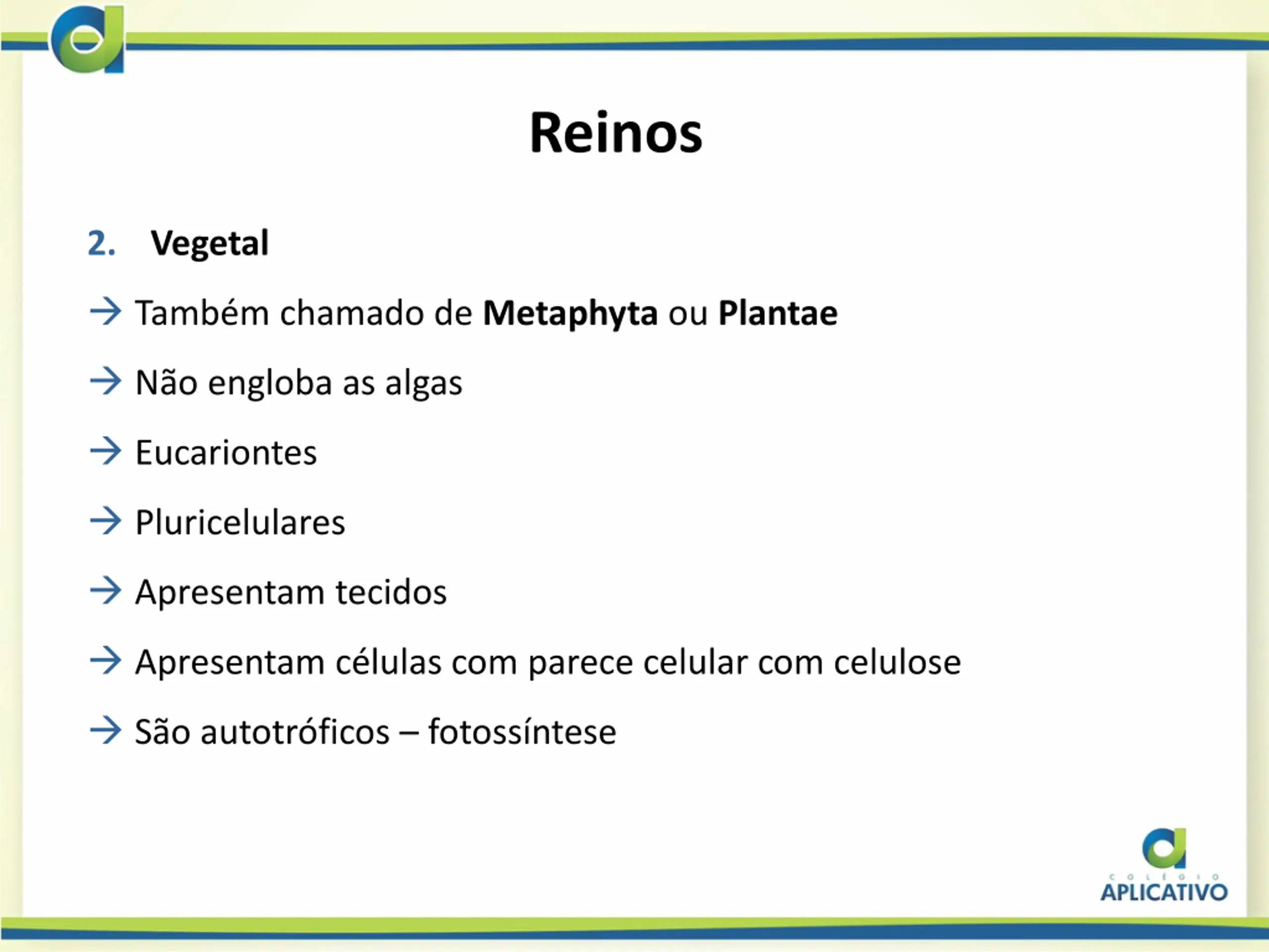 Reinos 2. Vegetal Tamb m chamado de Metaphyta ou Plantae N o engloba as algas Eucariontes Pluricelulares Apresentam tecidos Apresentam c lulas com parece celular com celulose S o autotr ficos fotoss ntese