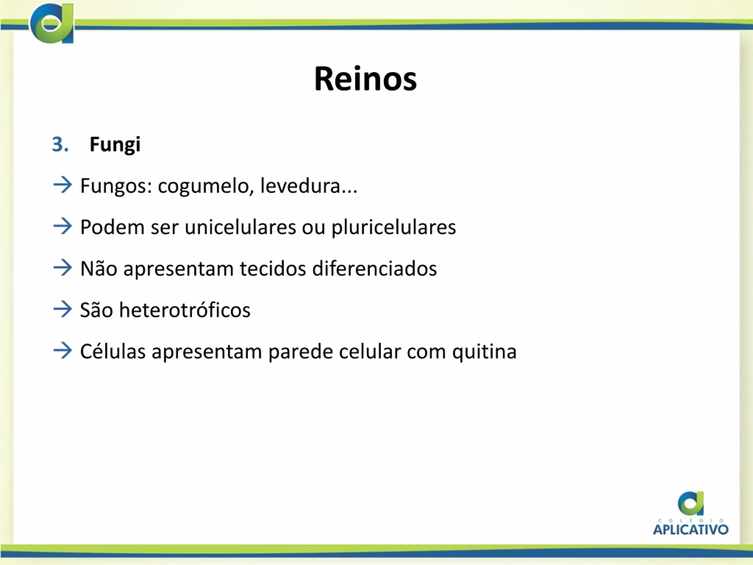Reinos 3. Fungi Fungos: cogumelo, levedura... Podem ser unicelulares ou pluricelulares N o apresentam tecidos diferenciados S o heterotr ficos C lulas apresentam parede celular com quitina
