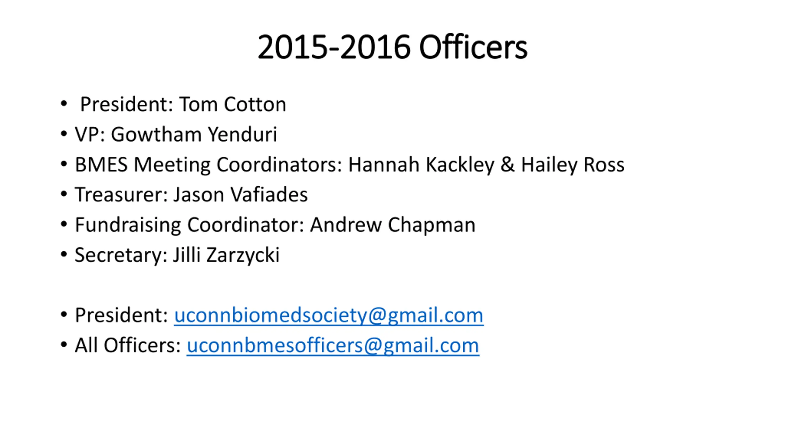 2015 2015- -2016 2016 Officers Officers President: Tom Cotton VP: Gowtham Yenduri BMES Meeting Coordinators: Hannah Kackley & Hailey Ross Treasurer: Jason Vafiades Fundraising Coordinator: Andrew Chapman Secretary: Jilli Zarzycki President: uconnbiomedsociety@gmail.com All Officers: uconnbmesofficers@gmail.com