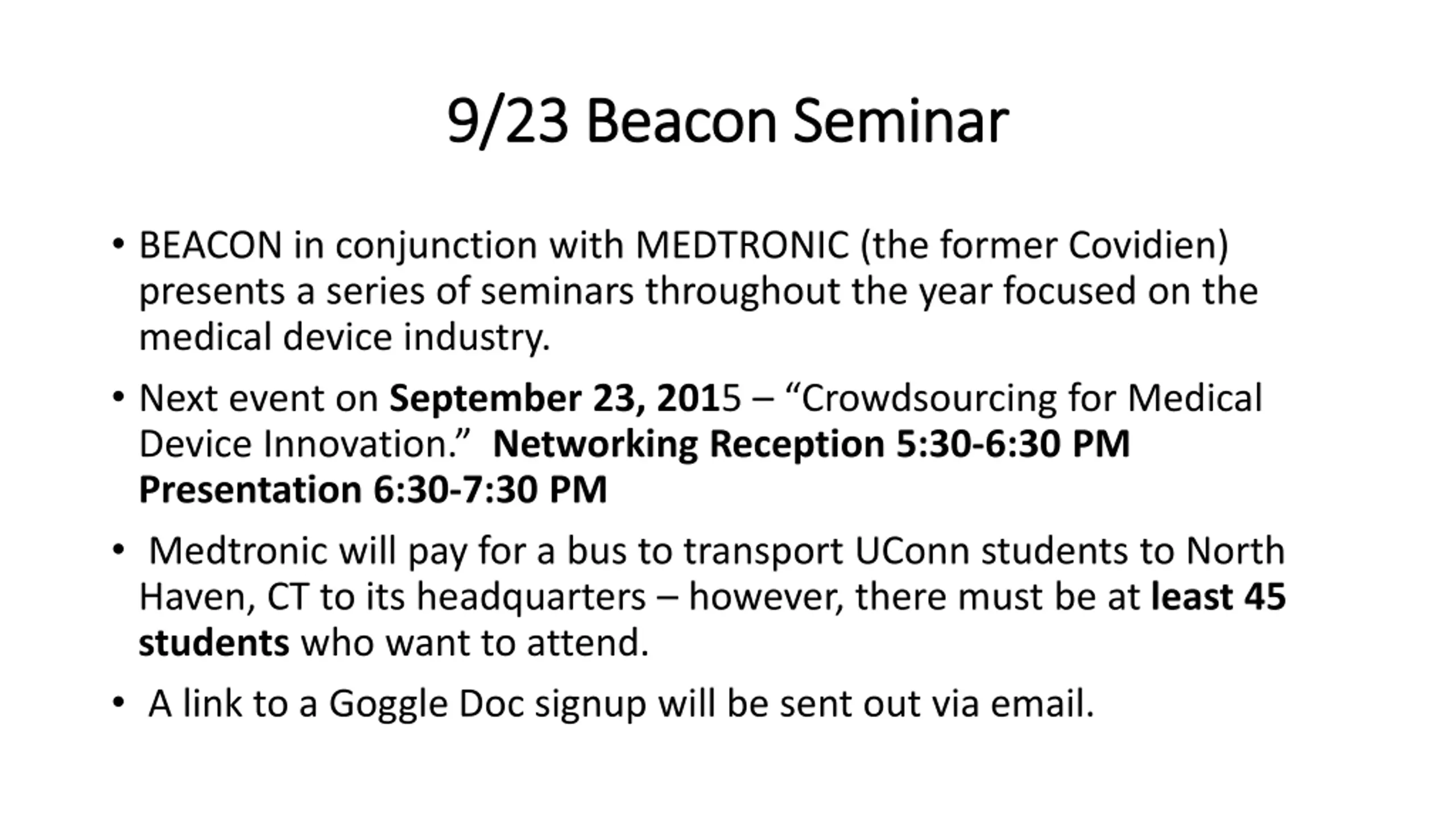 9/23 Beacon Seminar 9/23 Beacon Seminar BEACON in conjunction with MEDTRONIC (the former Covidien) presents a series of seminars throughout the year focused on the medical device industry. Next event on September 23, 2015 Crowdsourcing for Medical Device Innovation. Networking Reception 5:30-6:30 PM Presentation 6:30-7:30 PM Medtronic will pay for a bus to transport UConn students to North Haven, CT to its headquarters however, there must be at least 45 students who want to attend. A link to a Goggle Doc signup will be sent out via email.