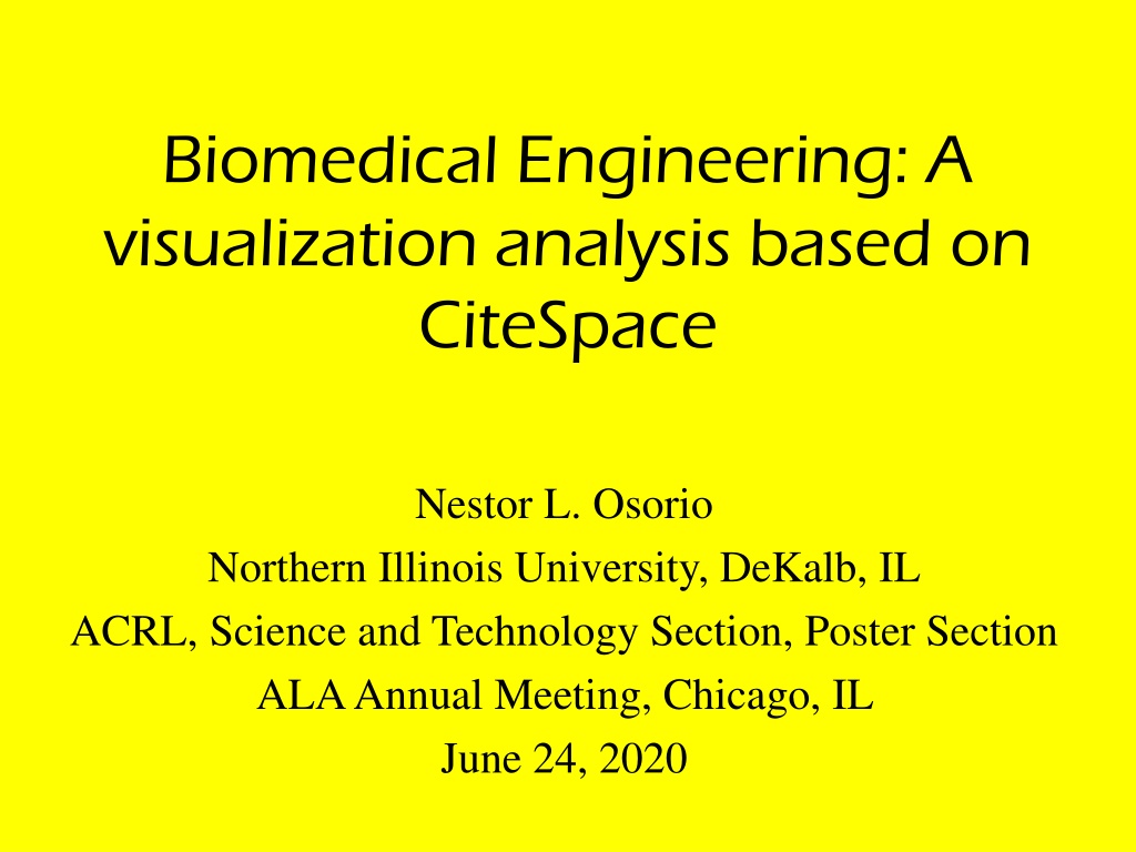 Biomedical Engineering: A visualization analysis based on CiteSpace Nestor L. Osorio Northern Illinois University, DeKalb, IL ACRL, Science and Technology Section, Poster Section ALA Annual Meeting, Chicago, IL June 24, 2020