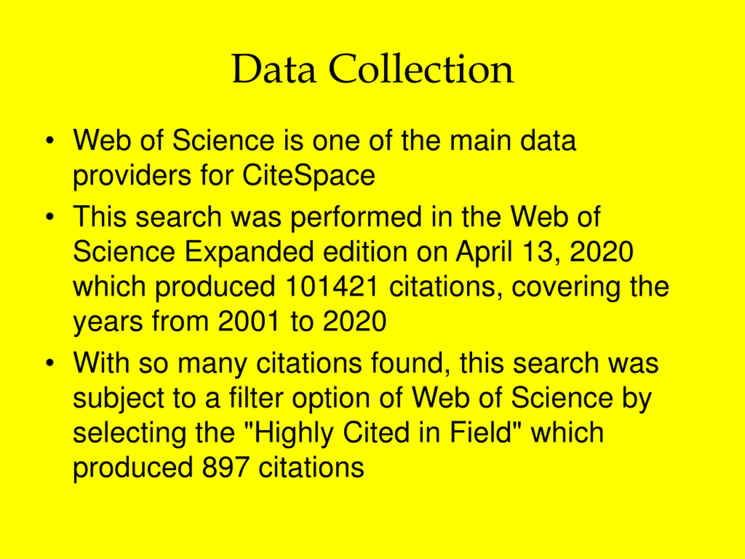 Data Collection Web of Science is one of the main data providers for CiteSpace This search was performed in the Web of Science Expanded edition on April 13, 2020 which produced 101421 citations, covering the years from 2001 to 2020 With so many citations found, this search was subject to a filter option of Web of Science by selecting the "Highly Cited in Field" which produced 897 citations