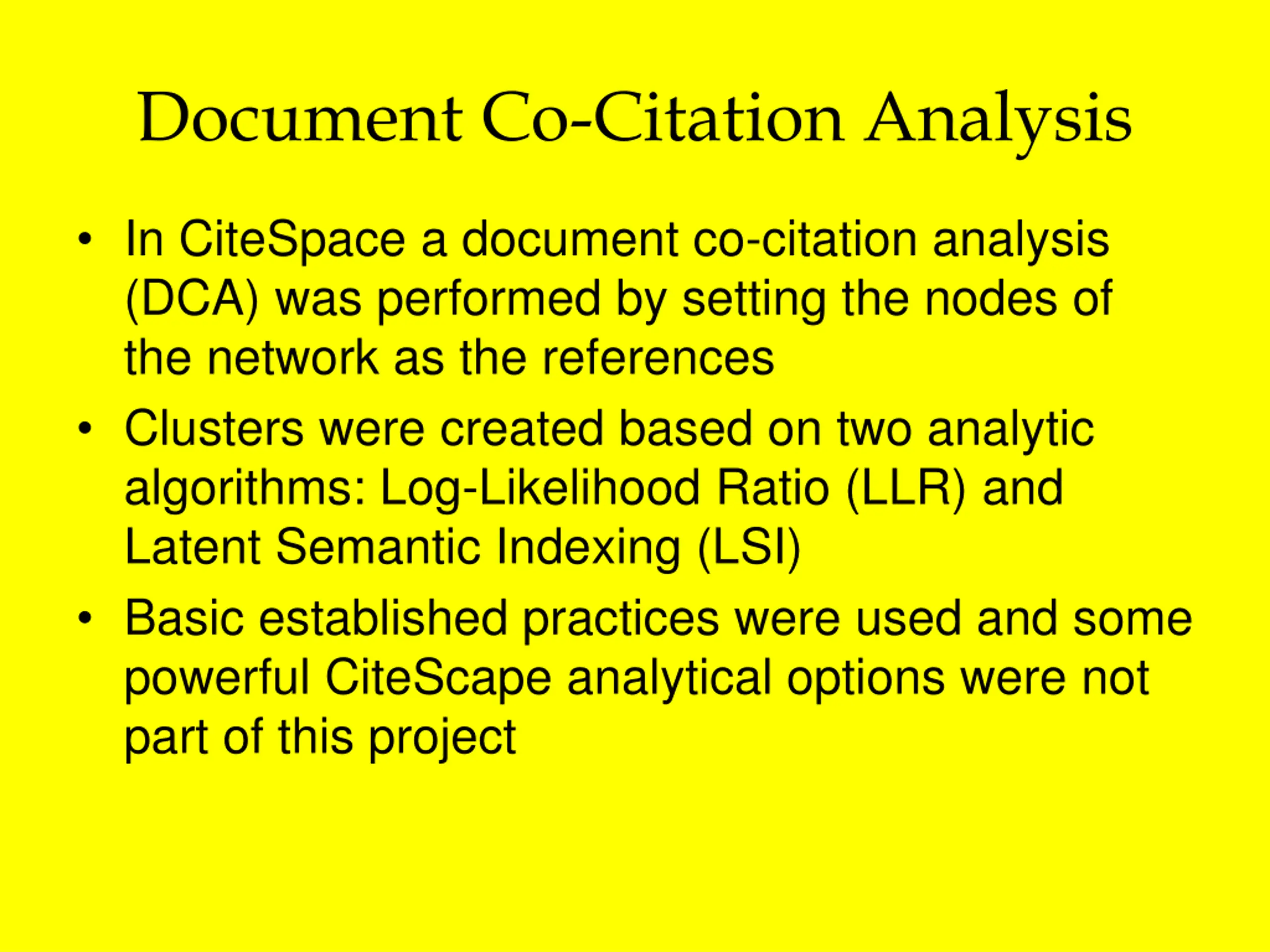 Document Co-Citation Analysis In CiteSpace a document co-citation analysis (DCA) was performed by setting the nodes of the network as the references Clusters were created based on two analytic algorithms: Log-Likelihood Ratio (LLR) and Latent Semantic Indexing (LSI) Basic established practices were used and some powerful CiteScape analytical options were not part of this project