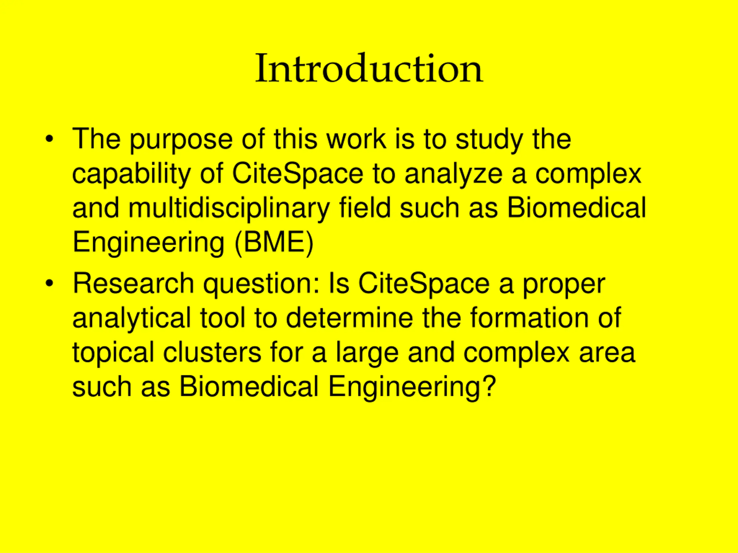 Introduction The purpose of this work is to study the capability of CiteSpace to analyze a complex and multidisciplinary field such as Biomedical Engineering (BME) Research question: Is CiteSpace a proper analytical tool to determine the formation of topical clusters for a large and complex area such as Biomedical Engineering?