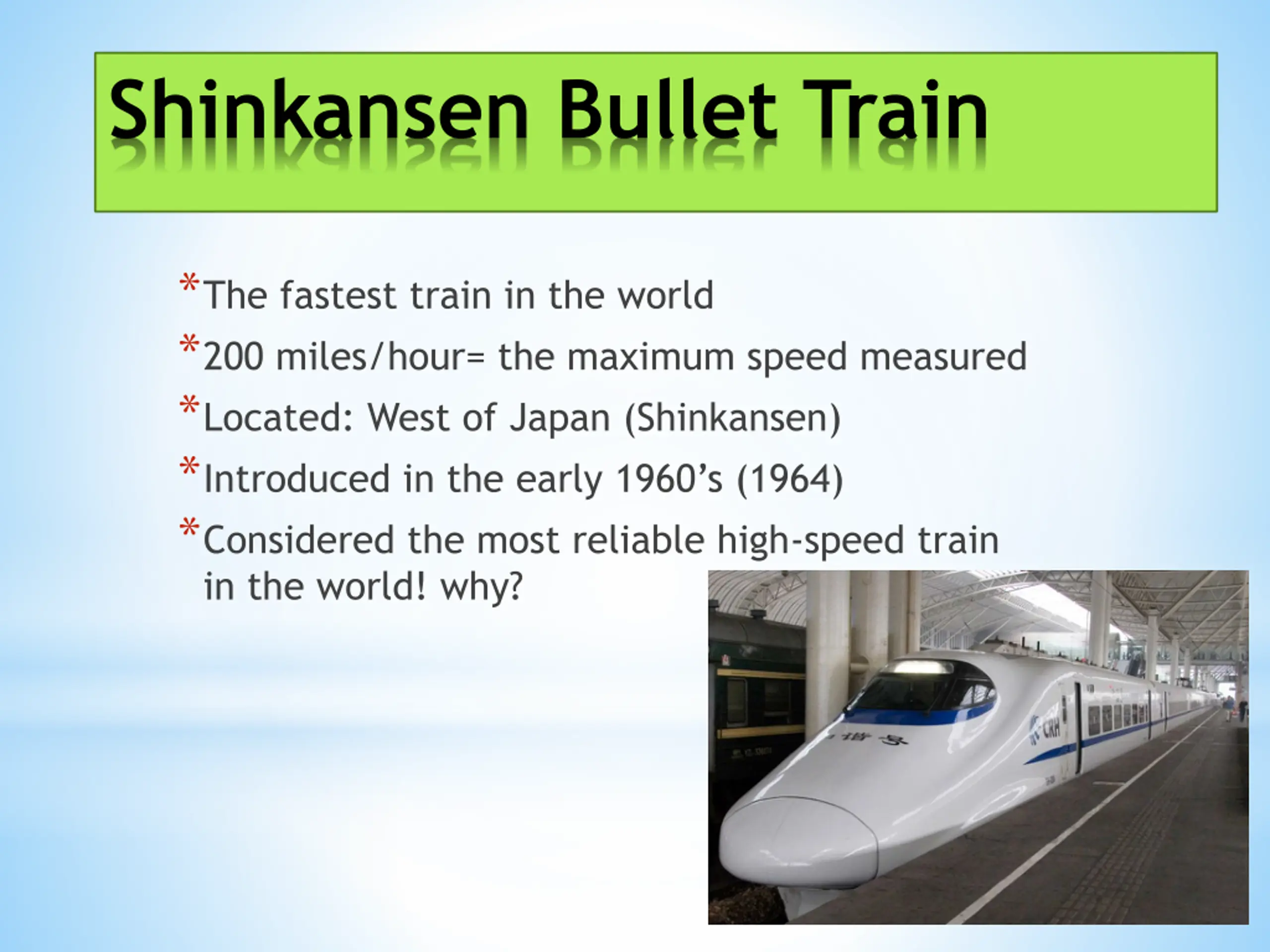 Shinkansen Bullet Train *The fastest train in the world *200 miles/hour= the maximum speed measured *Located: West of Japan (Shinkansen) *Introduced in the early 1960 s (1964) *Considered the most reliable high-speed train in the world! why?