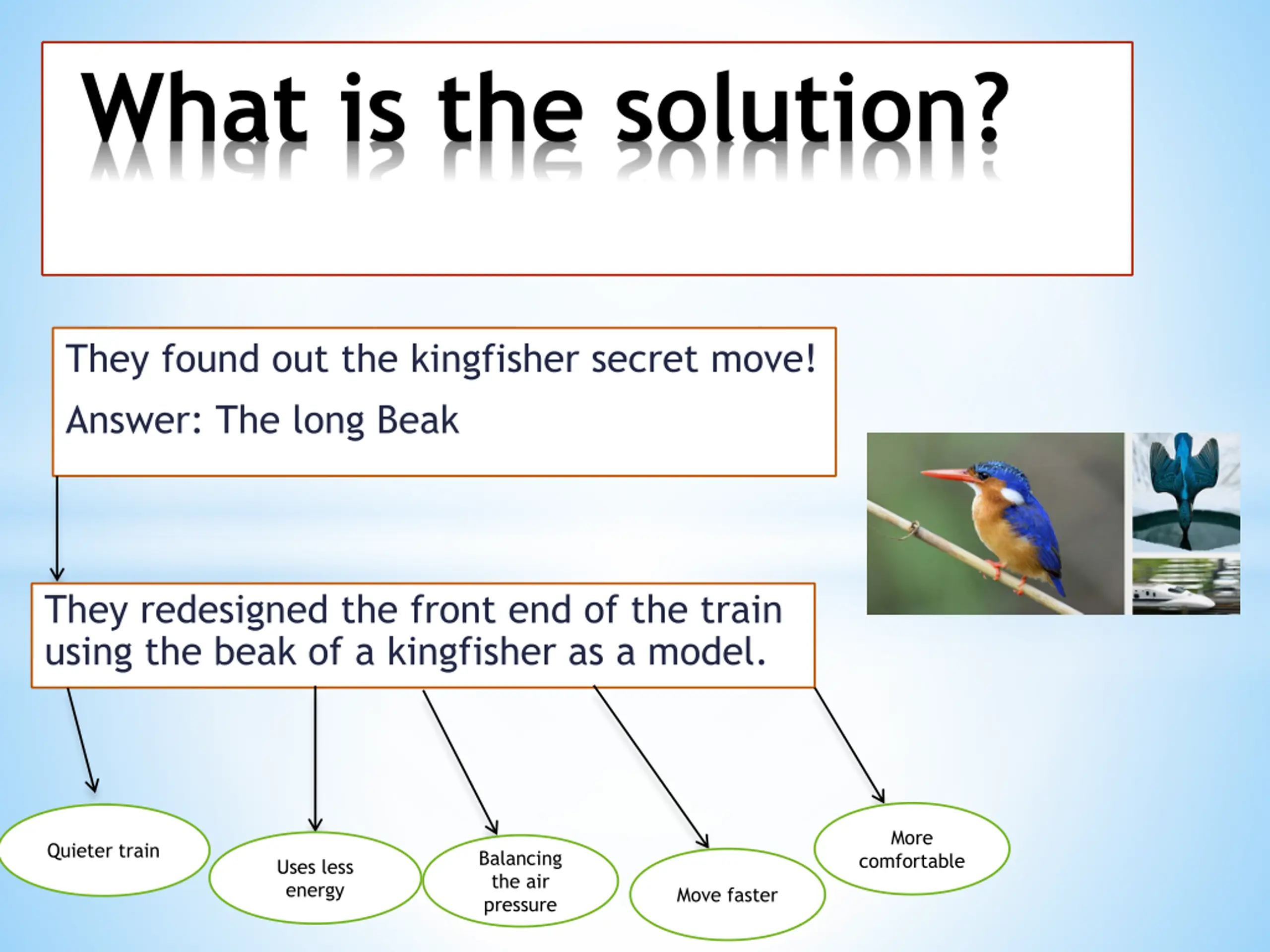 What is the solution? They found out the kingfisher secret move! Answer: The long Beak They redesigned the front end of the train using the beak of a kingfisher as a model. More Quieter train Balancing the air pressure comfortable Uses less energy Move faster