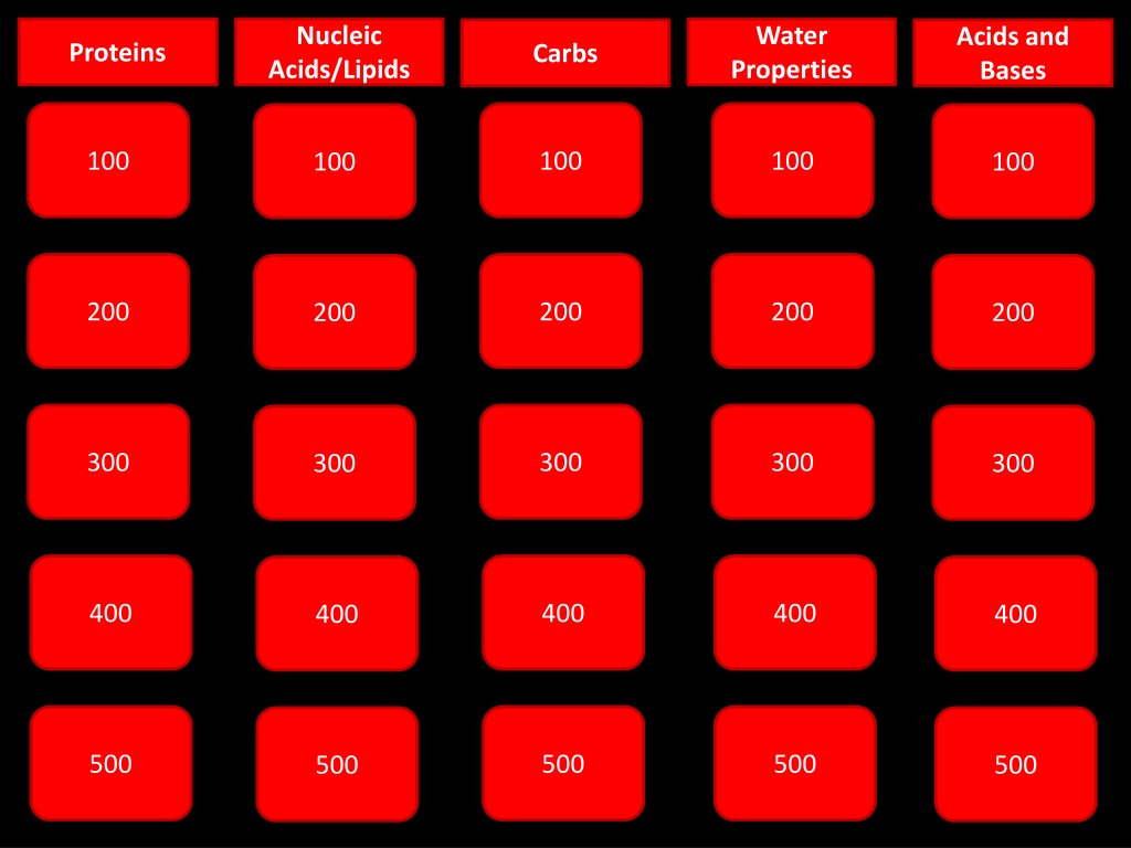 Nucleic Acids/Lipids Water Properties Acids and Bases Proteins Carbs 100 100 100 100 100 100 100 100 100 100 200 200 200 200 200 200 200 200 200 200 300 300 300 300 300 300 300 300 300 300 400 400 400 400 400 400 400 400 400 400 500 500 500 500 500 500 500 500 500 500