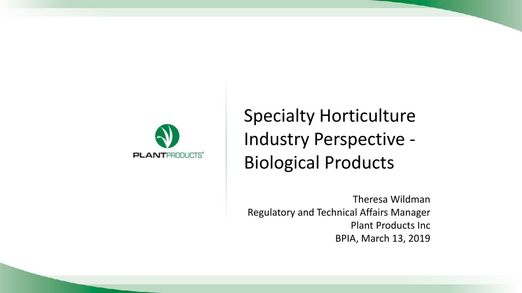 Specialty Horticulture Industry Perspective - Biological Products Theresa Wildman Regulatory and Technical Affairs Manager Plant Products Inc BPIA, March 13, 2019