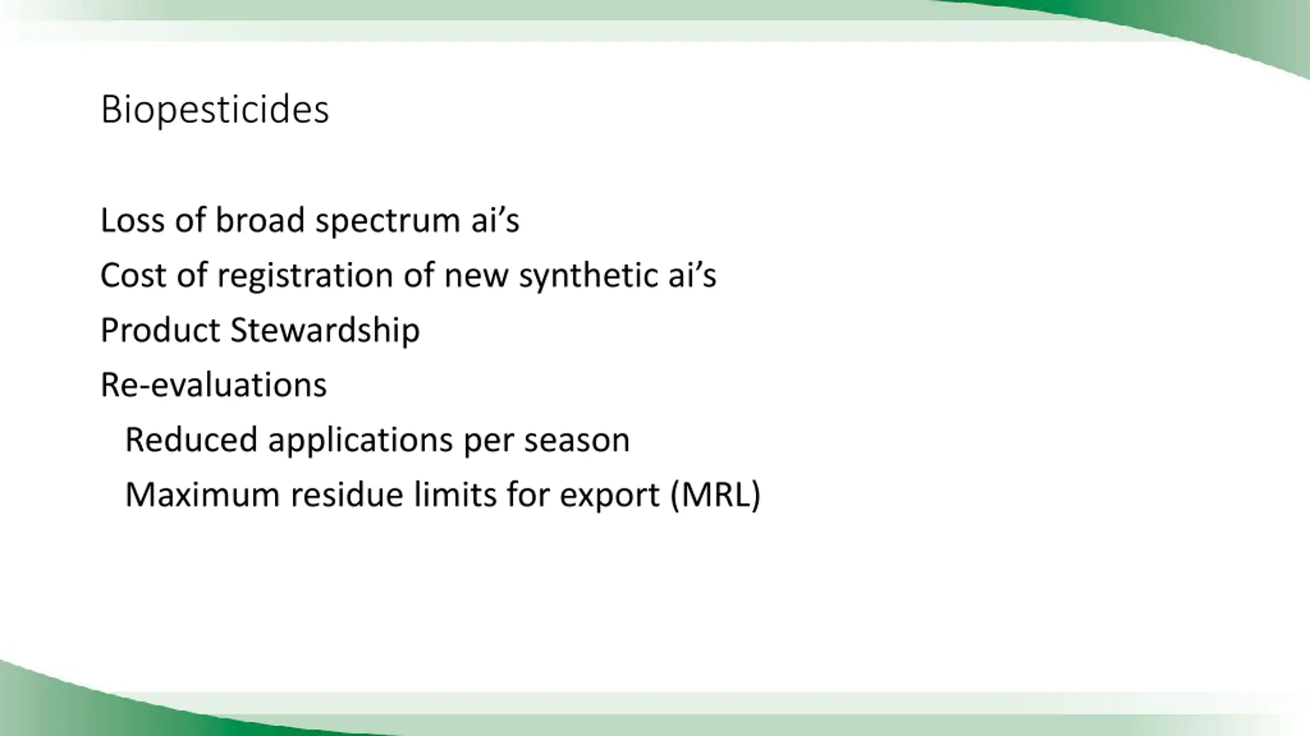 Biopesticides Loss of broad spectrum ai s Cost of registration of new synthetic ai s Product Stewardship Re-evaluations Reduced applications per season Maximum residue limits for export (MRL)
