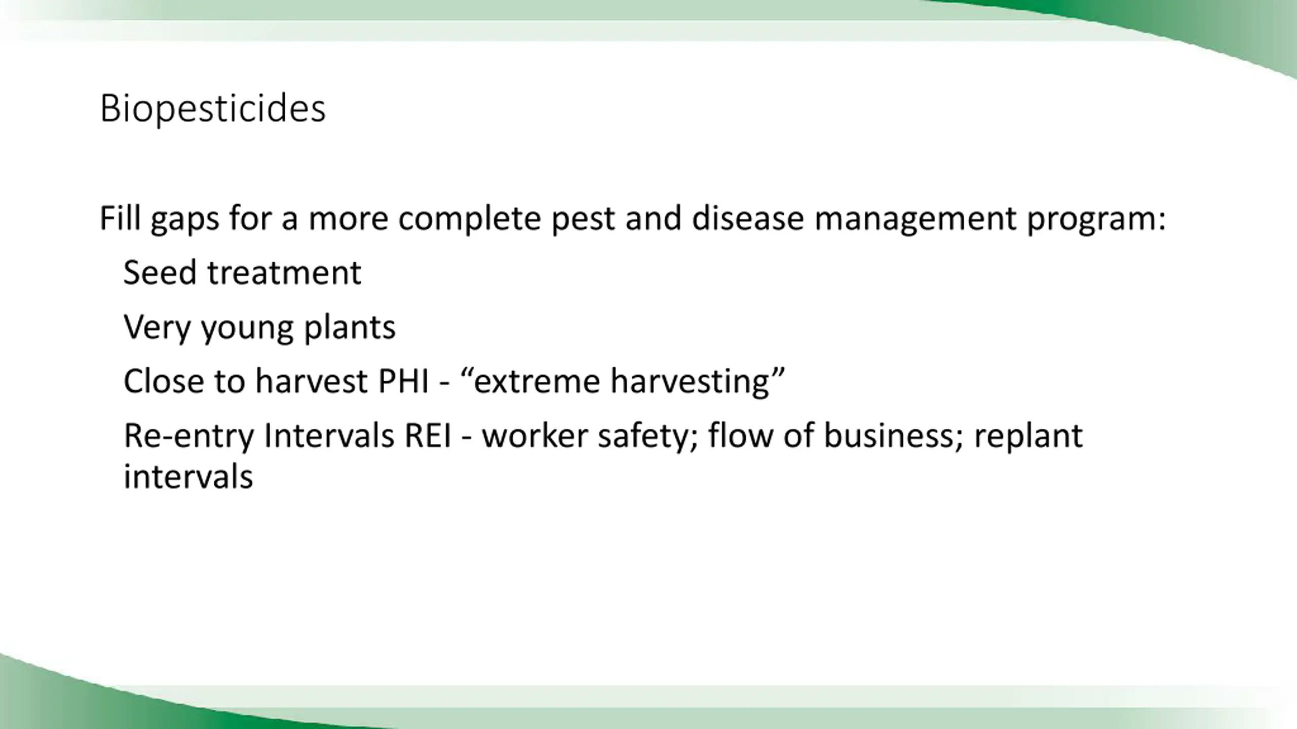 Biopesticides Fill gaps for a more complete pest and disease management program: Seed treatment Very young plants Close to harvest PHI - extreme harvesting Re-entry Intervals REI - worker safety; flow of business; replant intervals