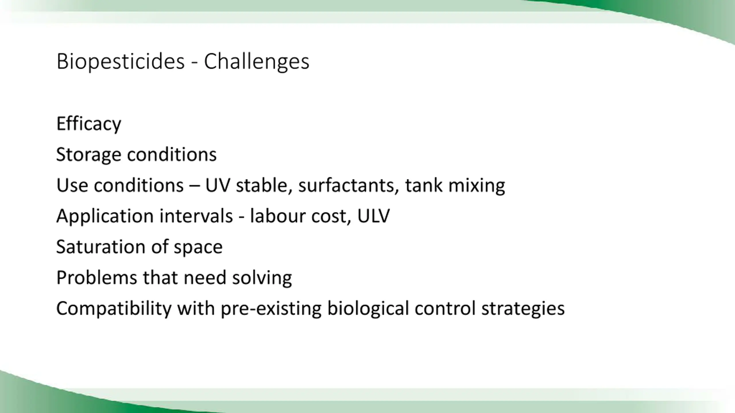 Biopesticides - Challenges Efficacy Storage conditions Use conditions UV stable, surfactants, tank mixing Application intervals - labour cost, ULV Saturation of space Problems that need solving Compatibility with pre-existing biological control strategies