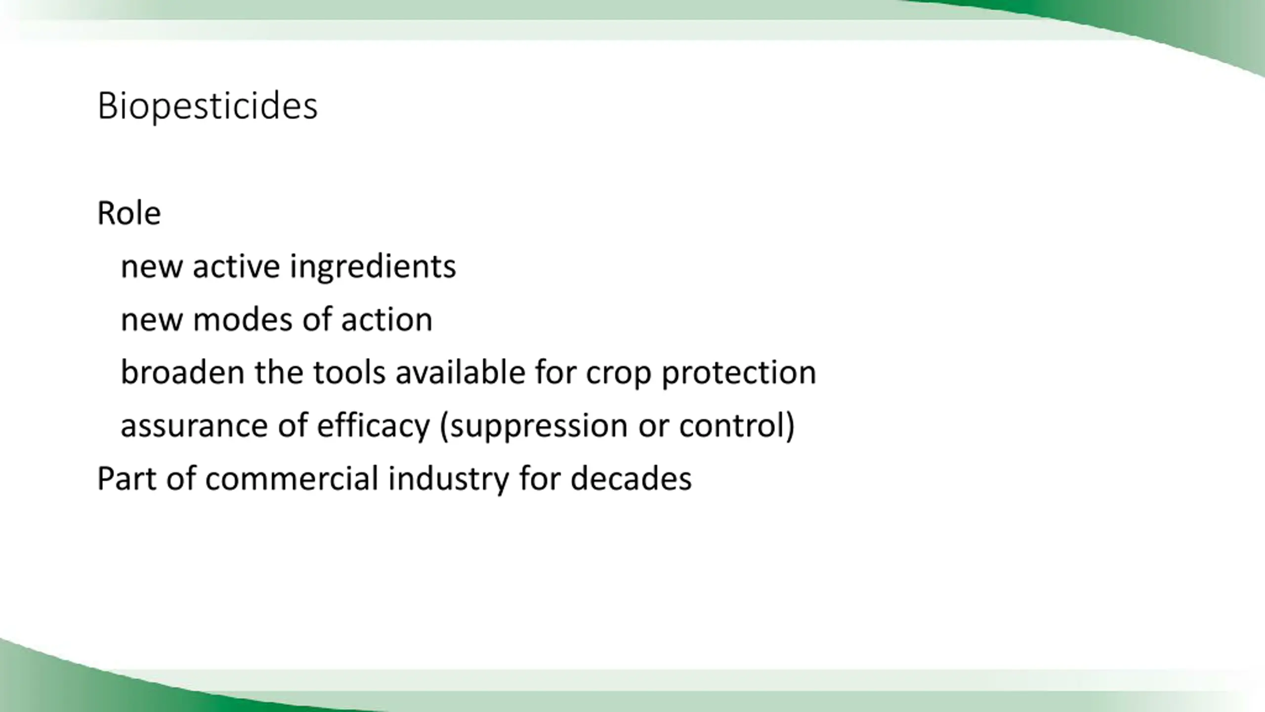 Biopesticides Role new active ingredients new modes of action broaden the tools available for crop protection assurance of efficacy (suppression or control) Part of commercial industry for decades