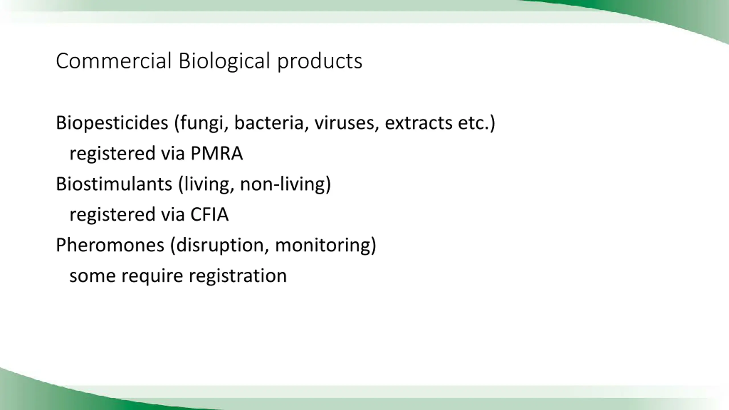 Commercial Biological products Biopesticides (fungi, bacteria, viruses, extracts etc.) registered via PMRA Biostimulants (living, non-living) registered via CFIA Pheromones (disruption, monitoring) some require registration