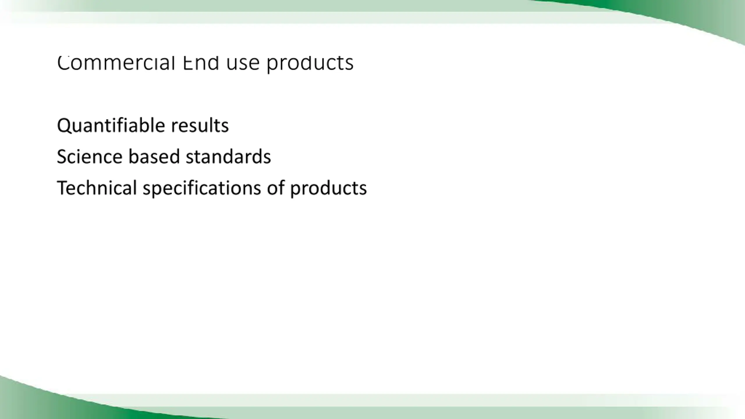 Commercial End use products Quantifiable results Science based standards Technical specifications of products