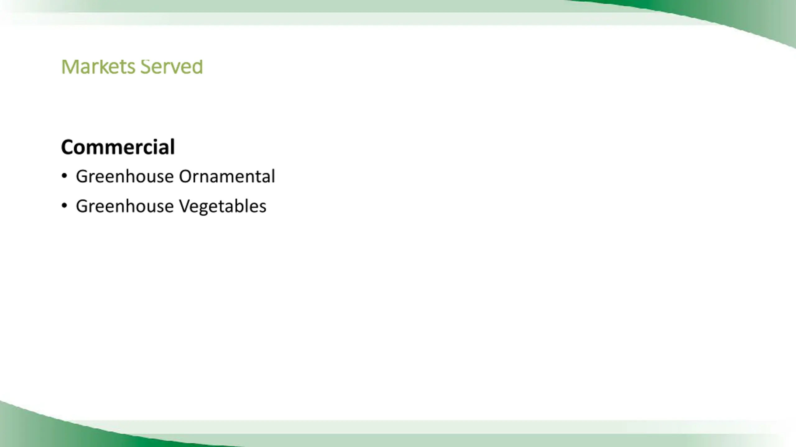 Markets Served Markets Served Commercial Greenhouse Ornamental Greenhouse Vegetables