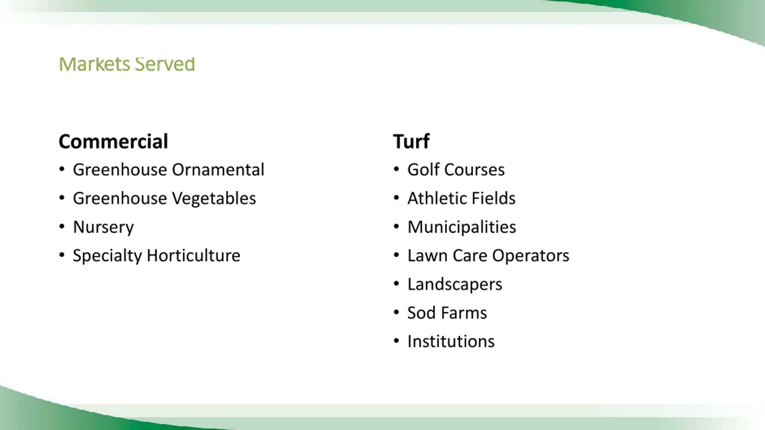 Markets Served Markets Served Commercial Greenhouse Ornamental Greenhouse Vegetables Nursery Specialty Horticulture Turf Golf Courses Athletic Fields Municipalities Lawn Care Operators Landscapers Sod Farms Institutions