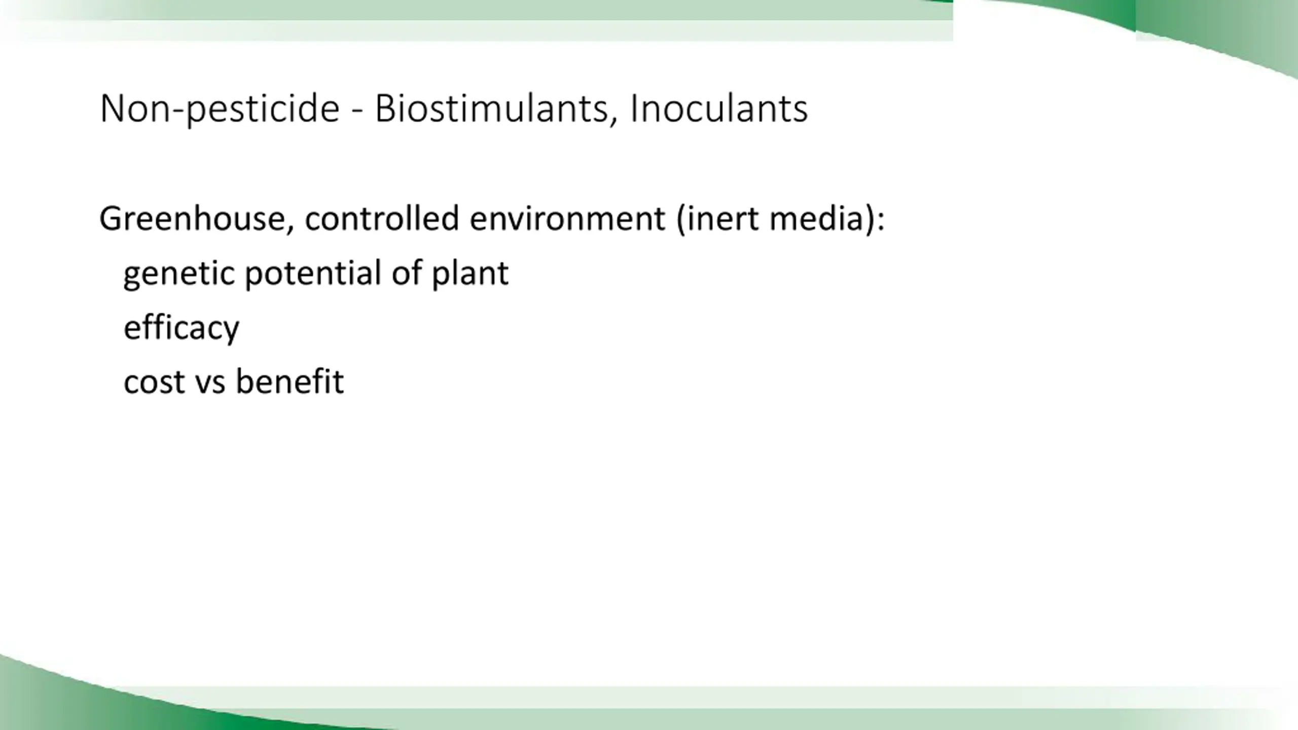 Non-pesticide - Biostimulants, Inoculants Greenhouse, controlled environment (inert media): genetic potential of plant efficacy cost vs benefit