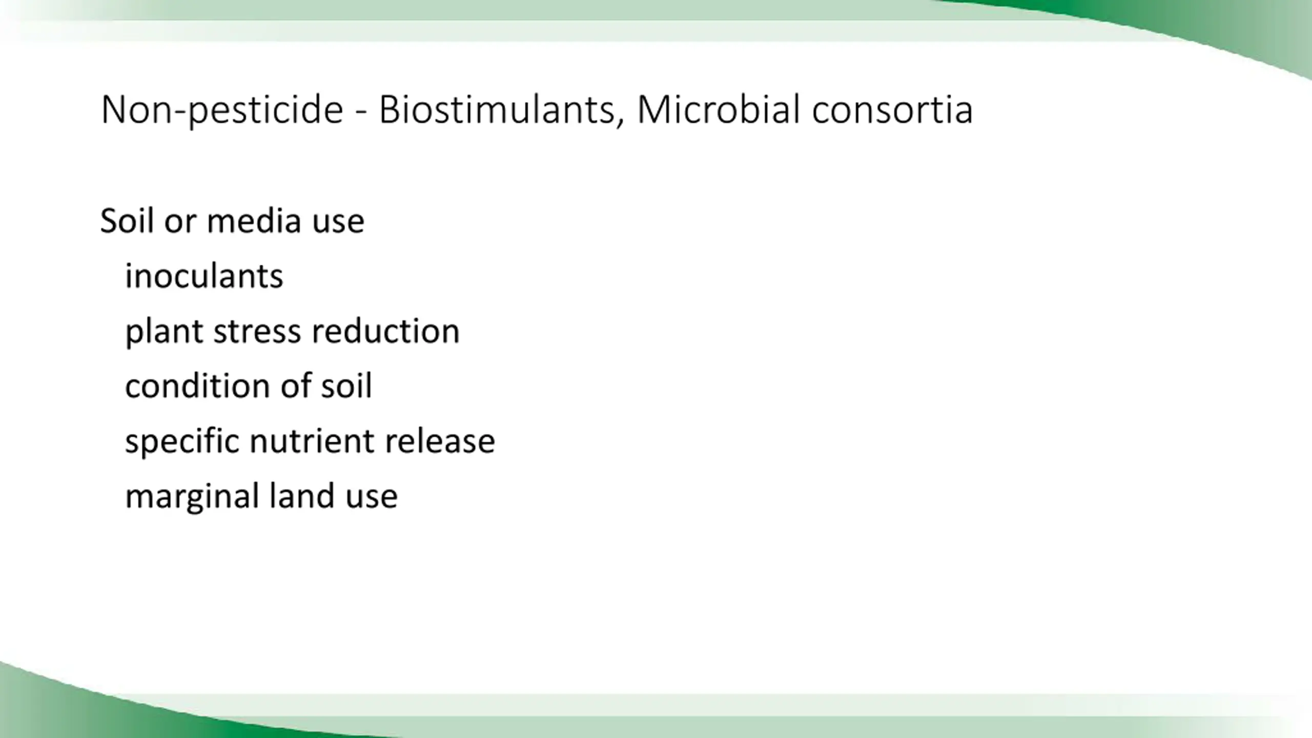 Non-pesticide - Biostimulants, Microbial consortia Soil or media use inoculants plant stress reduction condition of soil specific nutrient release marginal land use