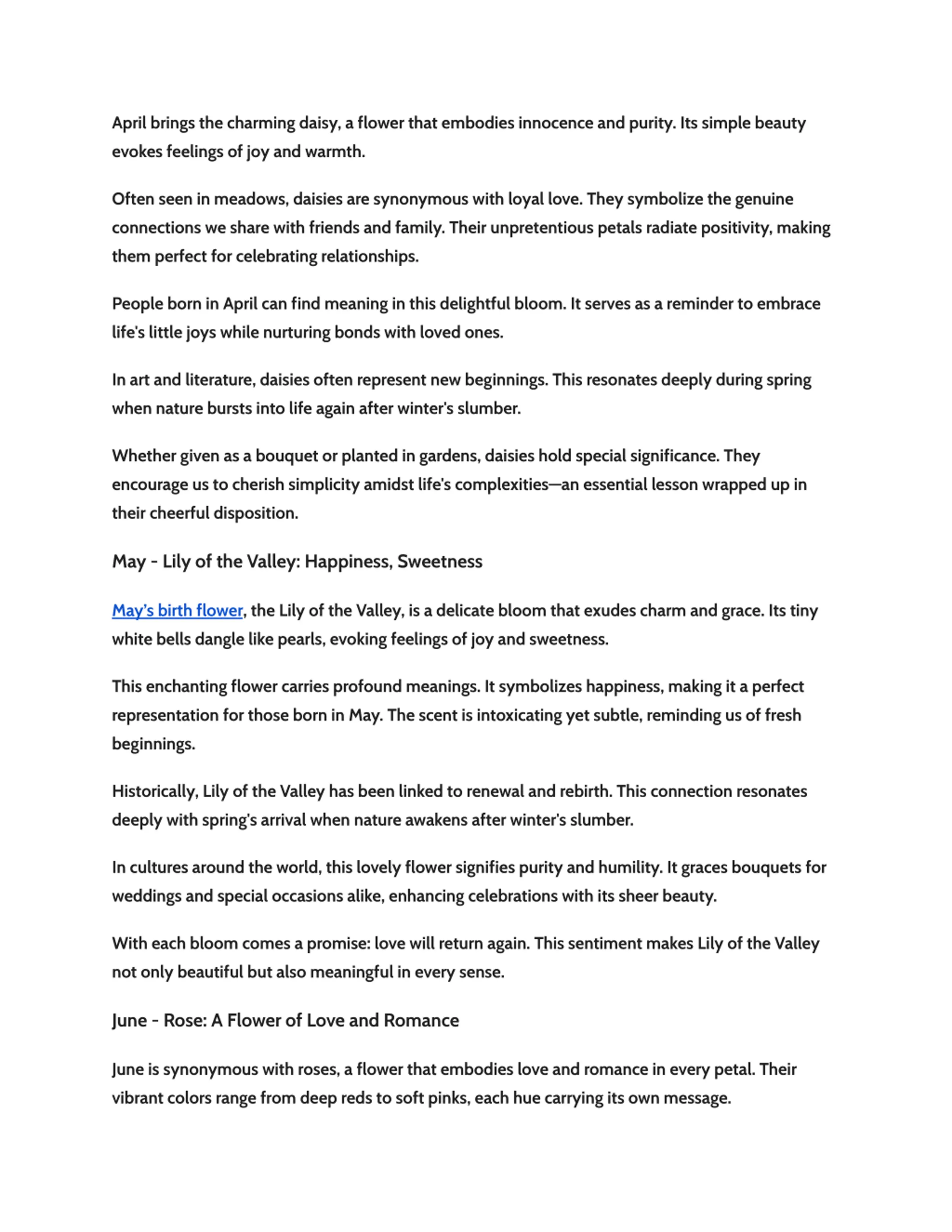 April brings the charming daisy, a flower that embodies innocence and purity. Its simple beauty evokes feelings of joy and warmth. Often seen in meadows, daisies are synonymous with loyal love. They symbolize the genuine connections we share with friends and family. Their unpretentious petals radiate positivity, making them perfect for celebrating relationships. People born in April can find meaning in this delightful bloom. It serves as a reminder to embrace life's little joys while nurturing bonds with loved ones. In art and literature, daisies often represent new beginnings. This resonates deeply during spring when nature bursts into life again after winter's slumber. Whether given as a bouquet or planted in gardens, daisies hold special significance. They encourage us to cherish simplicity amidst life's complexities an essential lesson wrapped up in their cheerful disposition. May - Lily of the Valley: Happiness, Sweetness May s birth flower, the Lily of the Valley, is a delicate bloom that exudes charm and grace. Its tiny white bells dangle like pearls, evoking feelings of joy and sweetness. This enchanting flower carries profound meanings. It symbolizes happiness, making it a perfect representation for those born in May. The scent is intoxicating yet subtle, reminding us of fresh beginnings. Historically, Lily of the Valley has been linked to renewal and rebirth. This connection resonates deeply with spring's arrival when nature awakens after winter's slumber. In cultures around the world, this lovely flower signifies purity and humility. It graces bouquets for weddings and special occasions alike, enhancing celebrations with its sheer beauty. With each bloom comes a promise: love will return again. This sentiment makes Lily of the Valley not only beautiful but also meaningful in every sense. June - Rose: A Flower of Love and Romance June is synonymous with roses, a flower that embodies love and romance in every petal. Their vibrant colors range from deep reds to soft pinks, each hue carrying its own message.