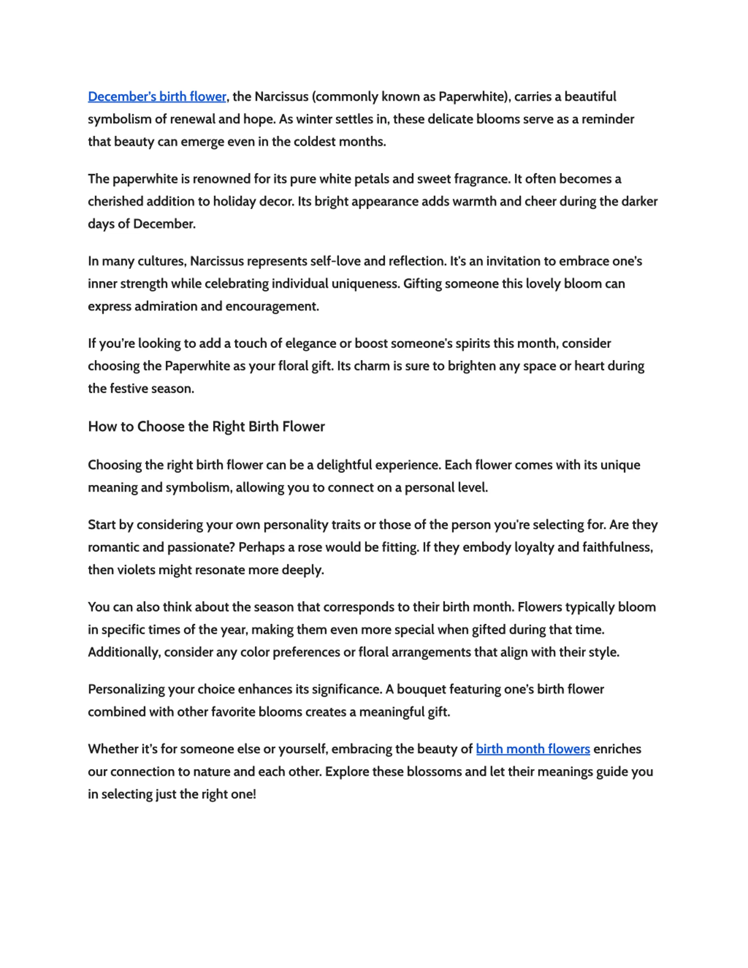 Decembers birth flower, the Narcissus (commonly known as Paperwhite), carries a beautiful symbolism of renewal and hope. As winter settles in, these delicate blooms serve as a reminder that beauty can emerge even in the coldest months. The paperwhite is renowned for its pure white petals and sweet fragrance. It often becomes a cherished addition to holiday decor. Its bright appearance adds warmth and cheer during the darker days of December. In many cultures, Narcissus represents self-love and reflection. It's an invitation to embrace one s inner strength while celebrating individual uniqueness. Gifting someone this lovely bloom can express admiration and encouragement. If you re looking to add a touch of elegance or boost someone's spirits this month, consider choosing the Paperwhite as your floral gift. Its charm is sure to brighten any space or heart during the festive season. How to Choose the Right Birth Flower Choosing the right birth flower can be a delightful experience. Each flower comes with its unique meaning and symbolism, allowing you to connect on a personal level. Start by considering your own personality traits or those of the person you're selecting for. Are they romantic and passionate? Perhaps a rose would be fitting. If they embody loyalty and faithfulness, then violets might resonate more deeply. You can also think about the season that corresponds to their birth month. Flowers typically bloom in specific times of the year, making them even more special when gifted during that time. Additionally, consider any color preferences or floral arrangements that align with their style. Personalizing your choice enhances its significance. A bouquet featuring one s birth flower combined with other favorite blooms creates a meaningful gift. Whether it s for someone else or yourself, embracing the beauty of birth month flowers enriches our connection to nature and each other. Explore these blossoms and let their meanings guide you in selecting just the right one!