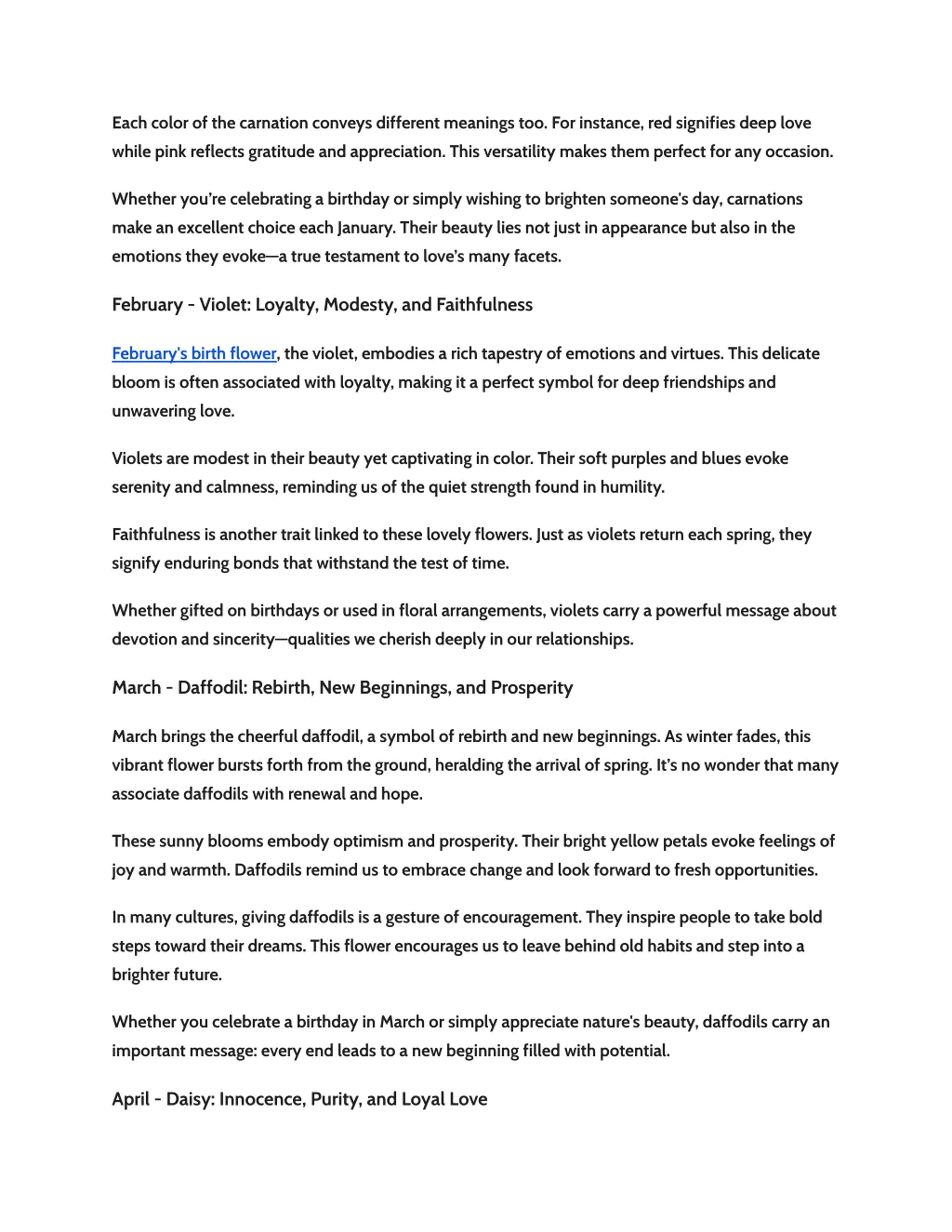 Birth Month Flowers and Their Meanings Have you ever wondered about the flowers that represent each month of the year? Birth month flowers are more than just pretty blooms; they carry deep meanings and rich histories. These floral symbols connect with our emotions, personalities, and even our life experiences. Whether you're celebrating a birthday or simply want to learn more about these enchanting flowers, diving into their significance can unveil a whole new layer of appreciation for nature s beauty. Let s explore this delightful world where each flower tells its own story! The History and Significance of Birth Month Flowers The tradition of associating flowers with birth months dates back centuries. Ancient cultures believed that each flower held special meanings and powers, reflecting the characteristics of those born in a particular month. In Roman times, people celebrated their birthdays with floral offerings to gods. These blooms symbolized health and prosperity for the coming year. As time passed, this practice evolved into identifying specific flowers linked to each month. Birth month flowers gained popularity during the Victorian era when symbolic meanings attached to plants became commonplace. Each flower was thought to convey emotions or traits relevant to individuals born under its sign. Today, these vibrant blooms are more than just gifts; they embody personal significance and connection. Many choose them as heartfelt tokens that celebrate identity while honoring age-old traditions rooted in love and appreciation for nature's beauty. January - Carnation: Love, Fascination, and Distinction January's birth flower, the carnation, is a symbol of love and admiration. Known for its ruffled petals and vibrant shades, this flower captures attention effortlessly. The carnation carries with it a rich history, often associated with fascination and distinction. People have gifted these blooms throughout the ages to express deep feelings of affection or admiration for someone special in their lives.