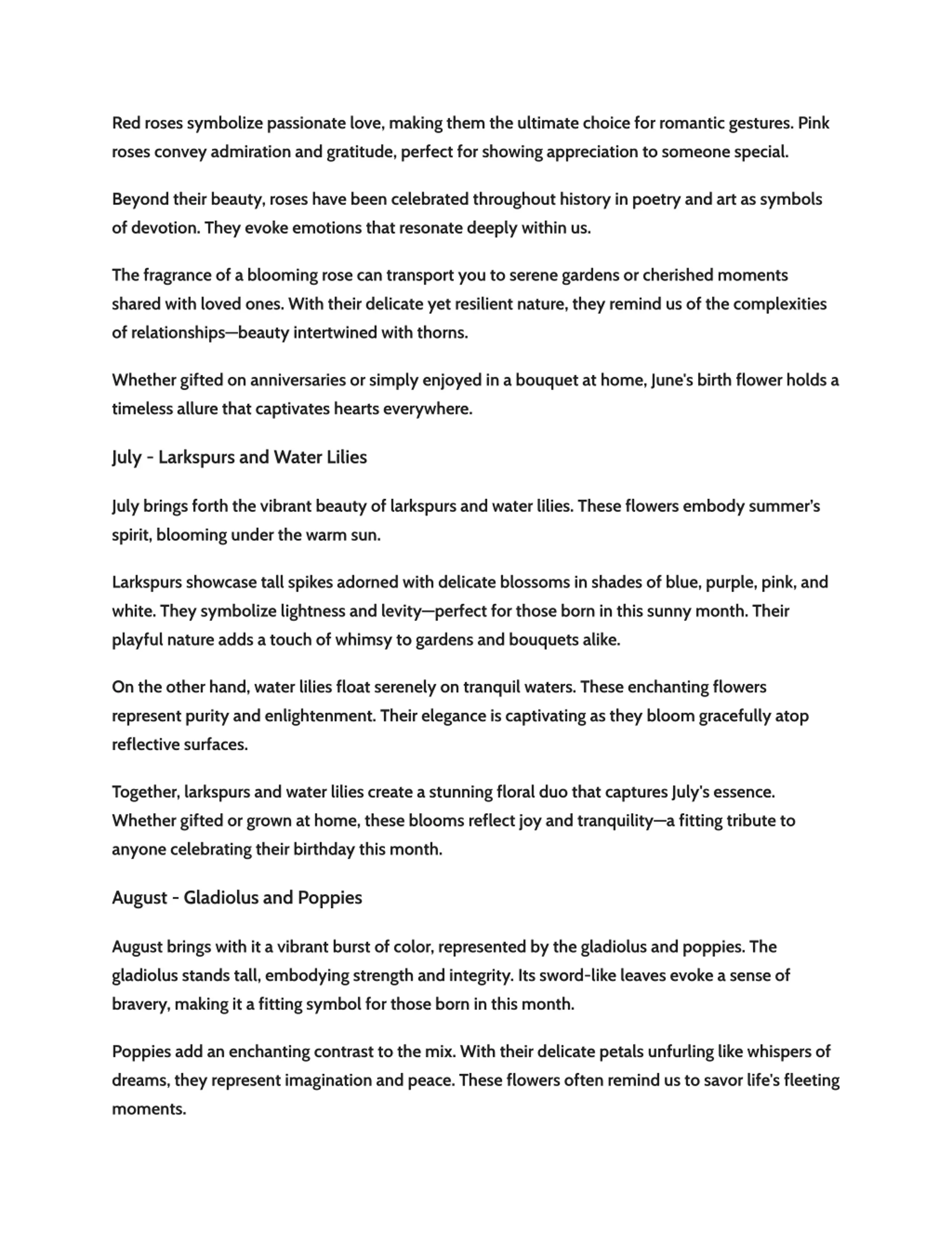 Red roses symbolize passionate love, making them the ultimate choice for romantic gestures. Pink roses convey admiration and gratitude, perfect for showing appreciation to someone special. Beyond their beauty, roses have been celebrated throughout history in poetry and art as symbols of devotion. They evoke emotions that resonate deeply within us. The fragrance of a blooming rose can transport you to serene gardens or cherished moments shared with loved ones. With their delicate yet resilient nature, they remind us of the complexities of relationships beauty intertwined with thorns. Whether gifted on anniversaries or simply enjoyed in a bouquet at home, June's birth flower holds a timeless allure that captivates hearts everywhere. July - Larkspurs and Water Lilies July brings forth the vibrant beauty of larkspurs and water lilies. These flowers embody summer s spirit, blooming under the warm sun. Larkspurs showcase tall spikes adorned with delicate blossoms in shades of blue, purple, pink, and white. They symbolize lightness and levity perfect for those born in this sunny month. Their playful nature adds a touch of whimsy to gardens and bouquets alike. On the other hand, water lilies float serenely on tranquil waters. These enchanting flowers represent purity and enlightenment. Their elegance is captivating as they bloom gracefully atop reflective surfaces. Together, larkspurs and water lilies create a stunning floral duo that captures July's essence. Whether gifted or grown at home, these blooms reflect joy and tranquility a fitting tribute to anyone celebrating their birthday this month. August - Gladiolus and Poppies August brings with it a vibrant burst of color, represented by the gladiolus and poppies. The gladiolus stands tall, embodying strength and integrity. Its sword-like leaves evoke a sense of bravery, making it a fitting symbol for those born in this month. Poppies add an enchanting contrast to the mix. With their delicate petals unfurling like whispers of dreams, they represent imagination and peace. These flowers often remind us to savor life's fleeting moments.
