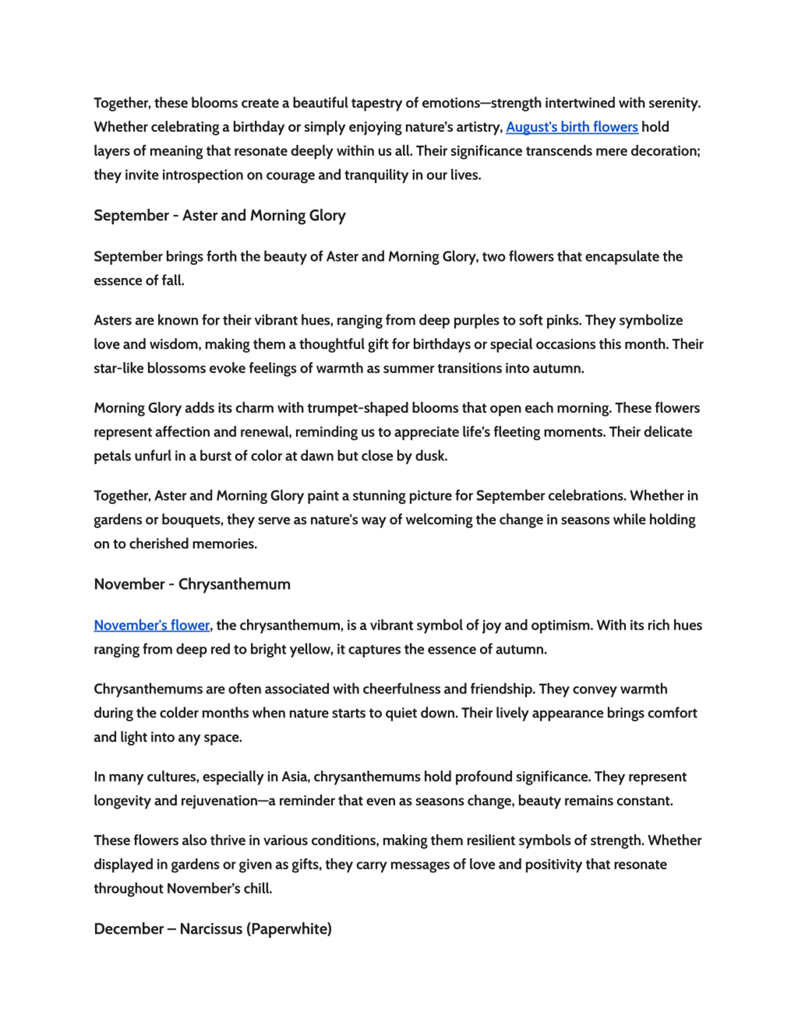 Together, these blooms create a beautiful tapestry of emotionsstrength intertwined with serenity. Whether celebrating a birthday or simply enjoying nature s artistry, August's birth flowers hold layers of meaning that resonate deeply within us all. Their significance transcends mere decoration; they invite introspection on courage and tranquility in our lives. September - Aster and Morning Glory September brings forth the beauty of Aster and Morning Glory, two flowers that encapsulate the essence of fall. Asters are known for their vibrant hues, ranging from deep purples to soft pinks. They symbolize love and wisdom, making them a thoughtful gift for birthdays or special occasions this month. Their star-like blossoms evoke feelings of warmth as summer transitions into autumn. Morning Glory adds its charm with trumpet-shaped blooms that open each morning. These flowers represent affection and renewal, reminding us to appreciate life s fleeting moments. Their delicate petals unfurl in a burst of color at dawn but close by dusk. Together, Aster and Morning Glory paint a stunning picture for September celebrations. Whether in gardens or bouquets, they serve as nature's way of welcoming the change in seasons while holding on to cherished memories. November - Chrysanthemum November's flower, the chrysanthemum, is a vibrant symbol of joy and optimism. With its rich hues ranging from deep red to bright yellow, it captures the essence of autumn. Chrysanthemums are often associated with cheerfulness and friendship. They convey warmth during the colder months when nature starts to quiet down. Their lively appearance brings comfort and light into any space. In many cultures, especially in Asia, chrysanthemums hold profound significance. They represent longevity and rejuvenation a reminder that even as seasons change, beauty remains constant. These flowers also thrive in various conditions, making them resilient symbols of strength. Whether displayed in gardens or given as gifts, they carry messages of love and positivity that resonate throughout November s chill. December Narcissus (Paperwhite)