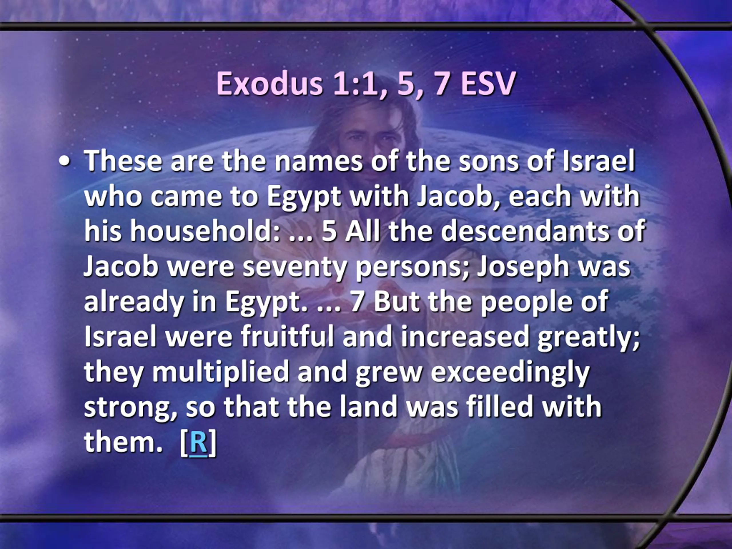 Exodus 1:1, 5, 7 ESV These are the names of the sons of Israel who came to Egypt with Jacob, each with his household: ... 5 All the descendants of Jacob were seventy persons; Joseph was already in Egypt. ... 7 But the people of Israel were fruitful and increased greatly; they multiplied and grew exceedingly strong, so that the land was filled with them. [R]
