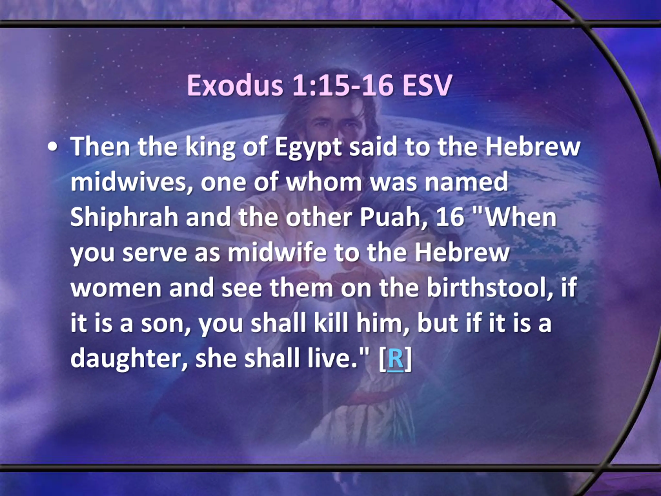 Exodus 1:15-16 ESV Then the king of Egypt said to the Hebrew midwives, one of whom was named Shiphrah and the other Puah, 16 "When you serve as midwife to the Hebrew women and see them on the birthstool, if it is a son, you shall kill him, but if it is a daughter, she shall live." [R]
