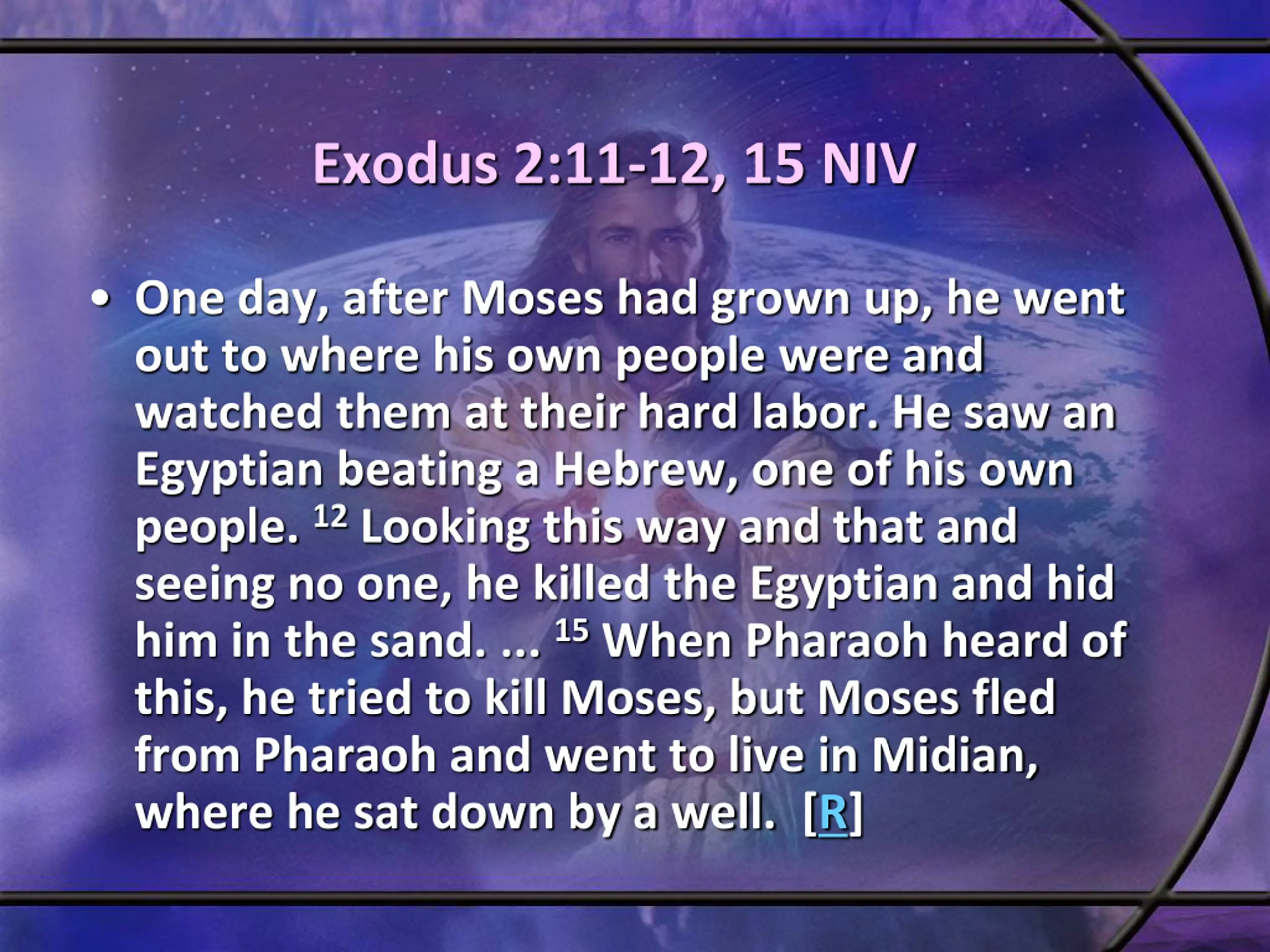 Exodus 2:11-12, 15 NIV One day, after Moses had grown up, he went out to where his own people were and watched them at their hard labor. He saw an Egyptian beating a Hebrew, one of his own people. 12Looking this way and that and seeing no one, he killed the Egyptian and hid him in the sand. ... 15When Pharaoh heard of this, he tried to kill Moses, but Moses fled from Pharaoh and went to live in Midian, where he sat down by a well. [R]