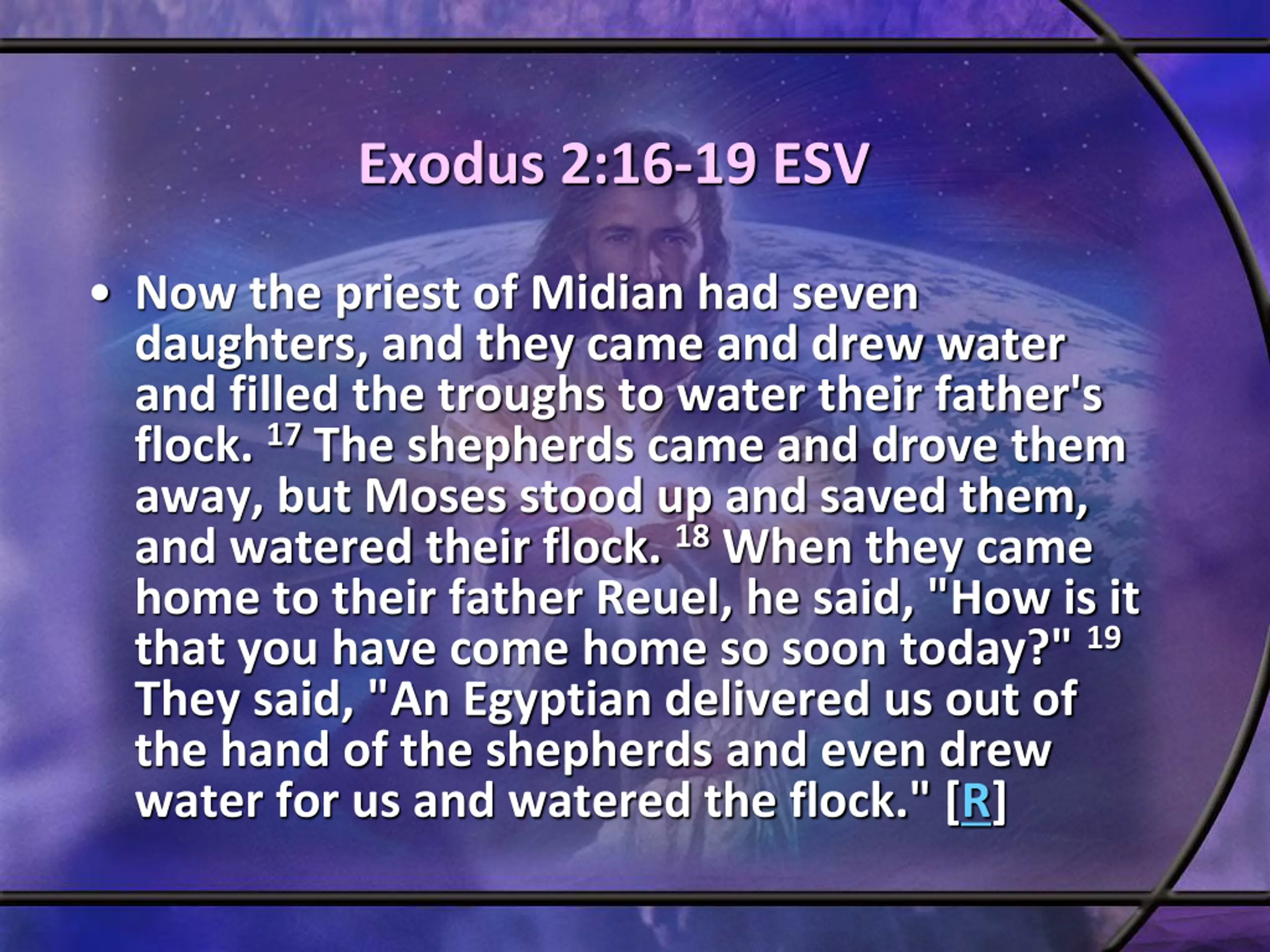Exodus 2:16-19 ESV Now the priest of Midian had seven daughters, and they came and drew water and filled the troughs to water their father's flock. 17 The shepherds came and drove them away, but Moses stood up and saved them, and watered their flock. 18 When they came home to their father Reuel, he said, "How is it that you have come home so soon today?" 19 They said, "An Egyptian delivered us out of the hand of the shepherds and even drew water for us and watered the flock." [R]