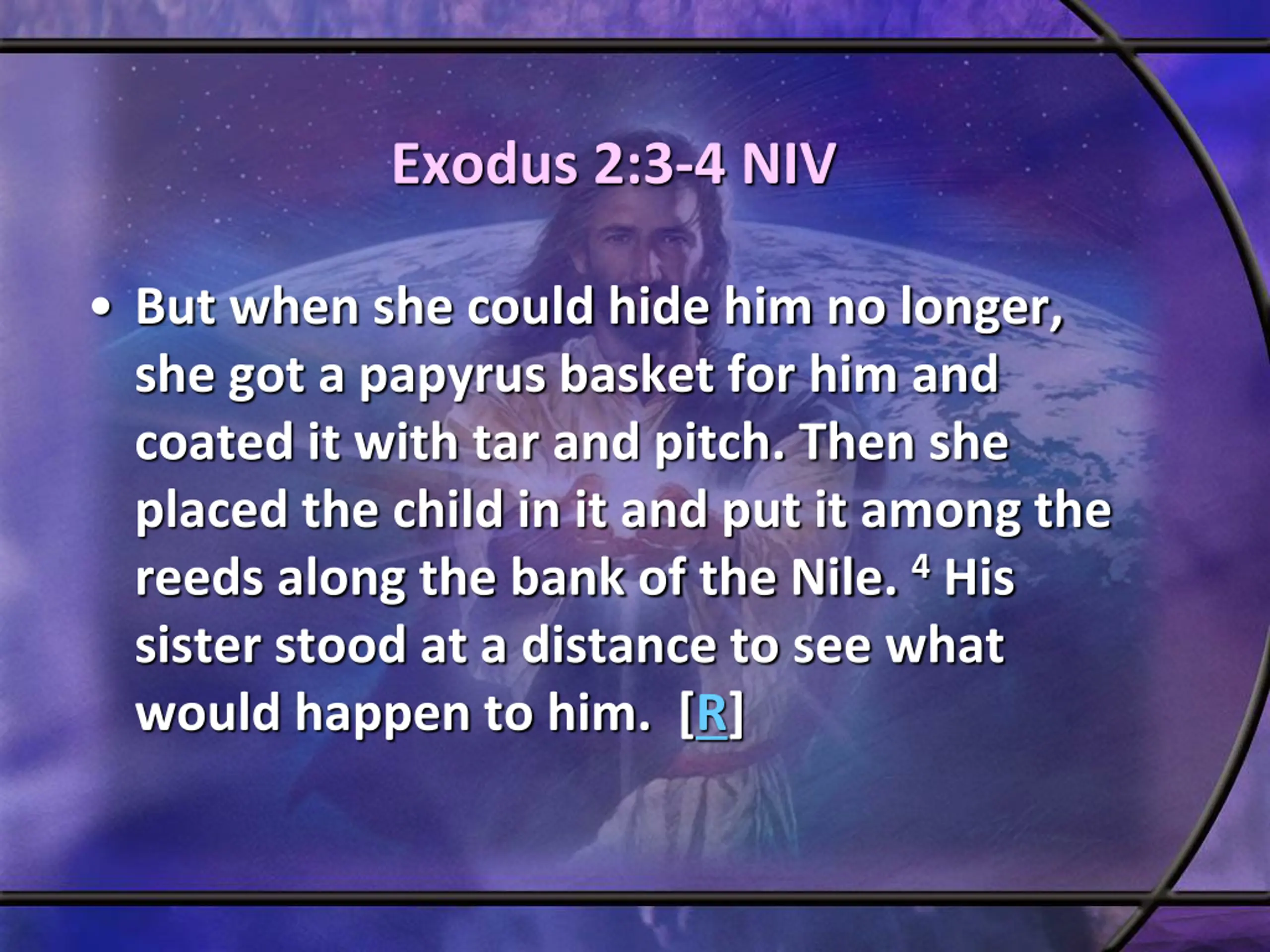 Exodus 2:3-4 NIV But when she could hide him no longer, she got a papyrus basket for him and coated it with tar and pitch. Then she placed the child in it and put it among the reeds along the bank of the Nile. 4His sister stood at a distance to see what would happen to him. [R]