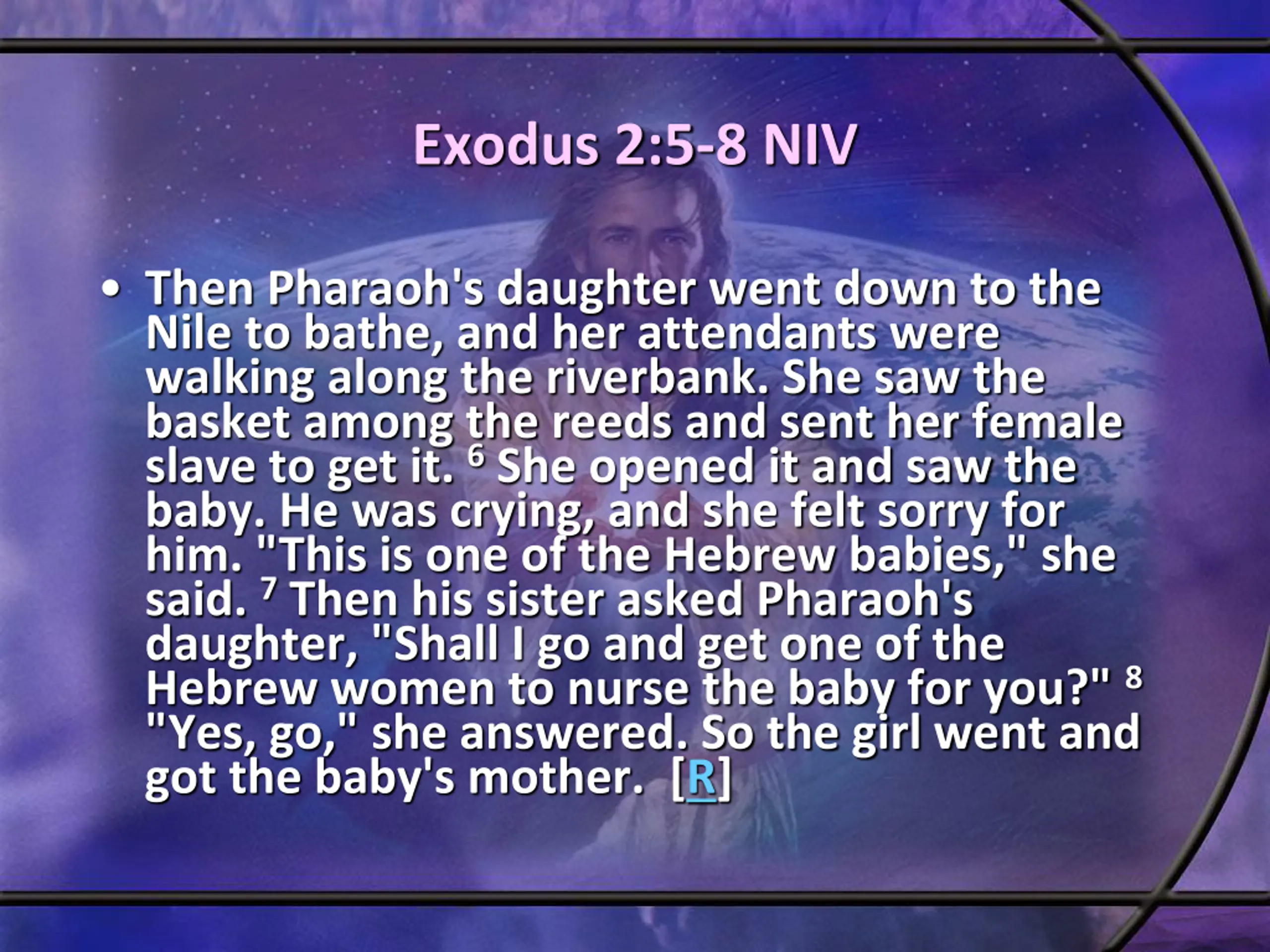 Exodus 2:5-8 NIV Then Pharaoh's daughter went down to the Nile to bathe, and her attendants were walking along the riverbank. She saw the basket among the reeds and sent her female slave to get it. 6She opened it and saw the baby. He was crying, and she felt sorry for him. "This is one of the Hebrew babies," she said. 7Then his sister asked Pharaoh's daughter, "Shall I go and get one of the Hebrew women to nurse the baby for you?" 8 "Yes, go," she answered. So the girl went and got the baby's mother. [R]