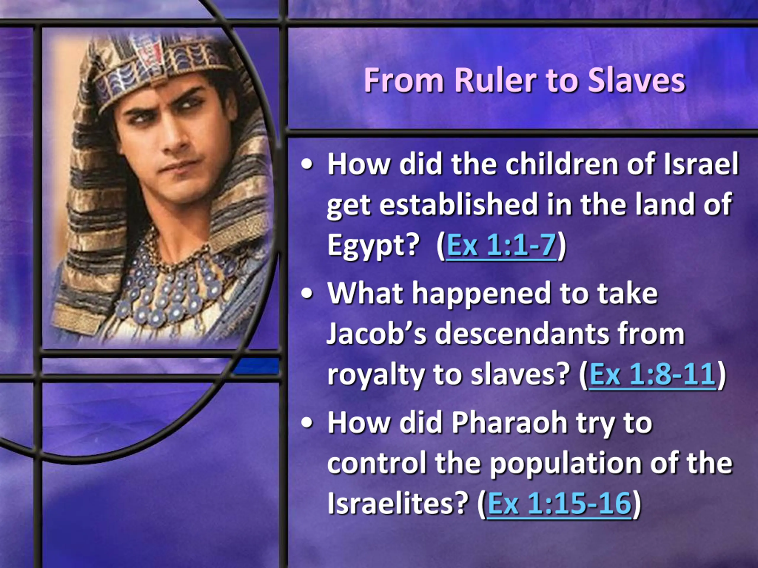 From Ruler to Slaves How did the children of Israel get established in the land of Egypt? (Ex 1:1-7) What happened to take Jacob s descendants from royalty to slaves? (Ex 1:8-11) How did Pharaoh try to control the population of the Israelites? (Ex 1:15-16)