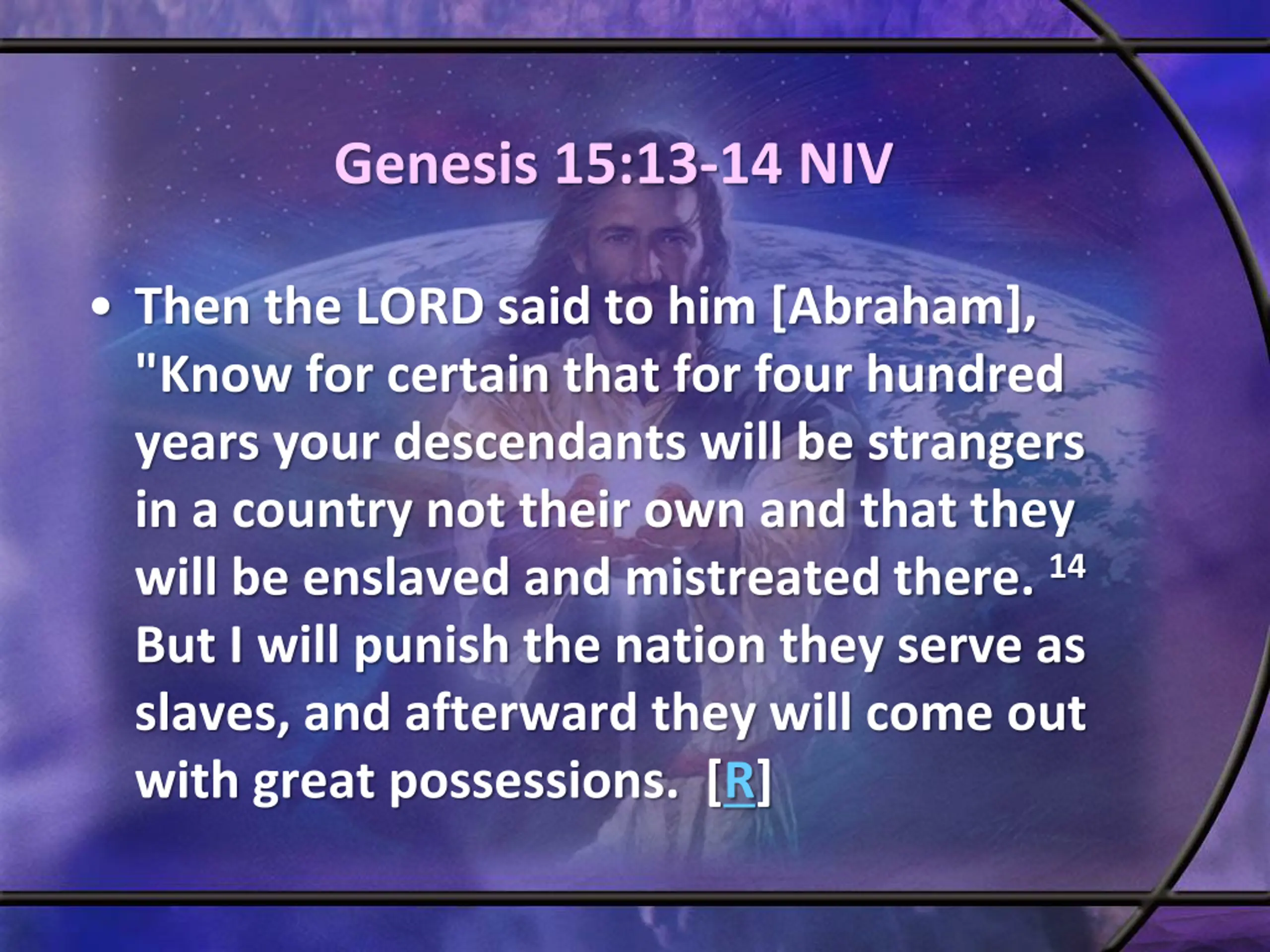 Genesis 15:13-14 NIV Then the LORD said to him [Abraham], "Know for certain that for four hundred years your descendants will be strangers in a country not their own and that they will be enslaved and mistreated there. 14 But I will punish the nation they serve as slaves, and afterward they will come out with great possessions. [R]