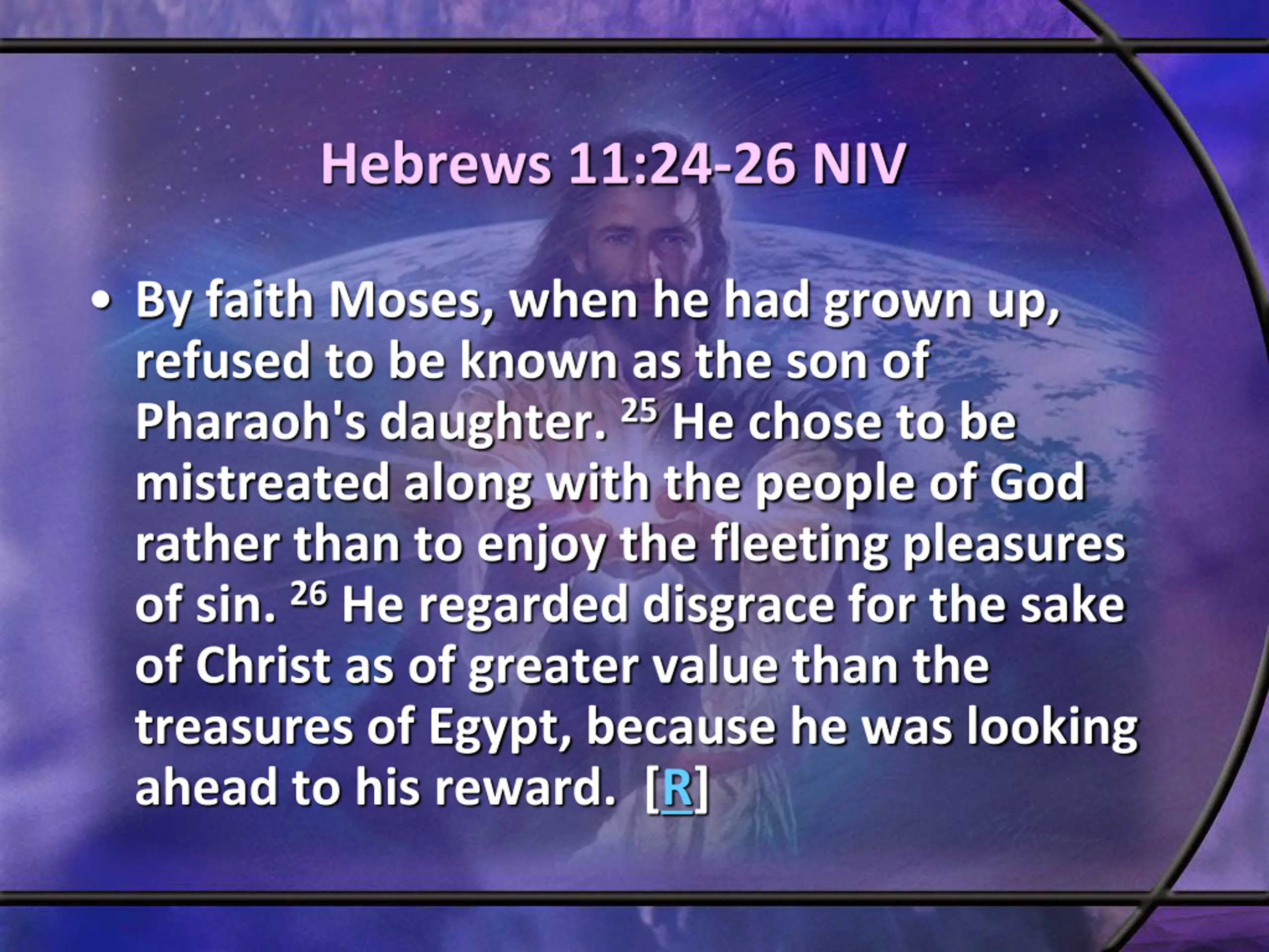 Hebrews 11:24-26 NIV By faith Moses, when he had grown up, refused to be known as the son of Pharaoh's daughter. 25 He chose to be mistreated along with the people of God rather than to enjoy the fleeting pleasures of sin. 26 He regarded disgrace for the sake of Christ as of greater value than the treasures of Egypt, because he was looking ahead to his reward. [R]