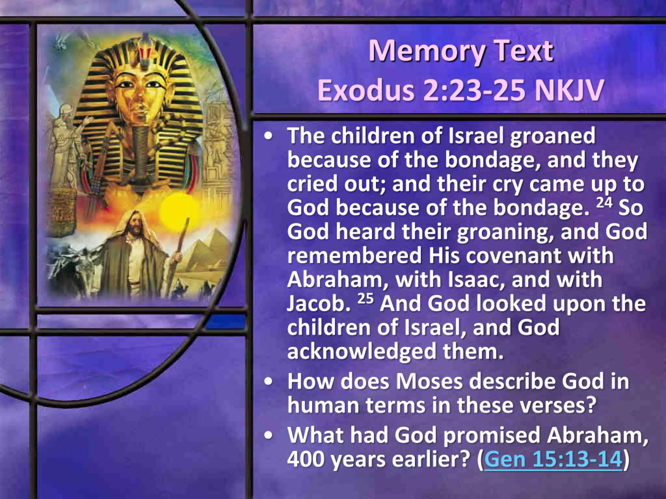Memory Text Exodus 2:23-25 NKJV The children of Israel groaned because of the bondage, and they cried out; and their cry came up to God because of the bondage. 24So God heard their groaning, and God remembered His covenant with Abraham, with Isaac, and with Jacob. 25And God looked upon the children of Israel, and God acknowledged them. How does Moses describe God in human terms in these verses? What had God promised Abraham, 400 years earlier? (Gen 15:13-14)