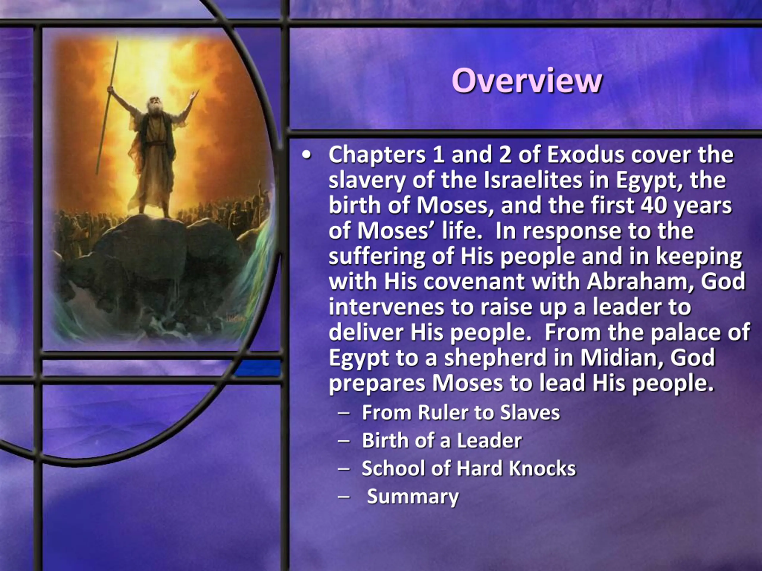 Overview Chapters 1 and 2 of Exodus cover the slavery of the Israelites in Egypt, the birth of Moses, and the first 40 years of Moses life. In response to the suffering of His people and in keeping with His covenant with Abraham, God intervenes to raise up a leader to deliver His people. From the palace of Egypt to a shepherd in Midian, God prepares Moses to lead His people. From Ruler to Slaves Birth of a Leader School of Hard Knocks Summary