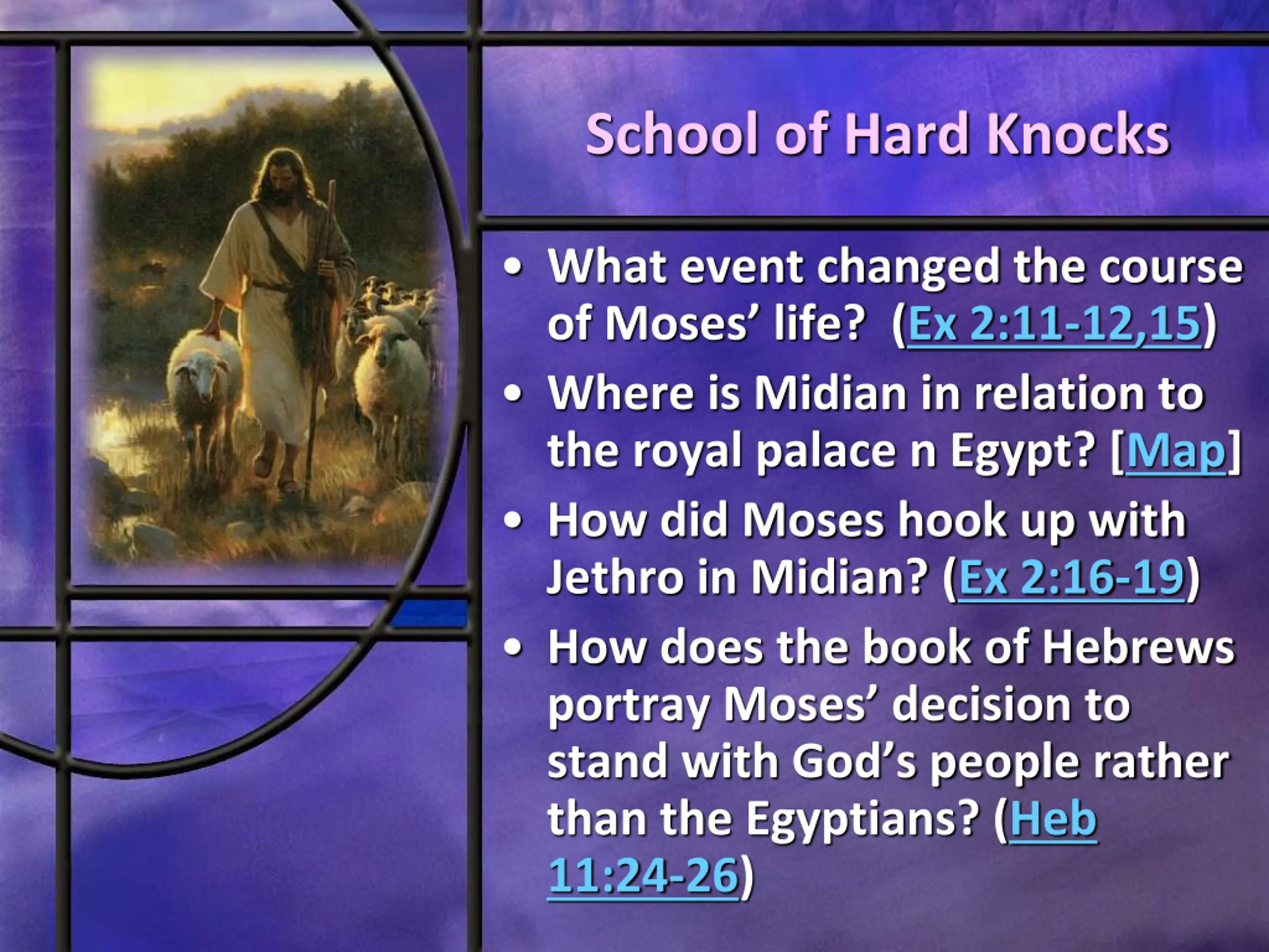 School of Hard Knocks What event changed the course of Moses life? (Ex 2:11-12,15) Where is Midian in relation to the royal palace n Egypt? [Map] How did Moses hook up with Jethro in Midian? (Ex 2:16-19) How does the book of Hebrews portray Moses decision to stand with God s people rather than the Egyptians? (Heb 11:24-26)