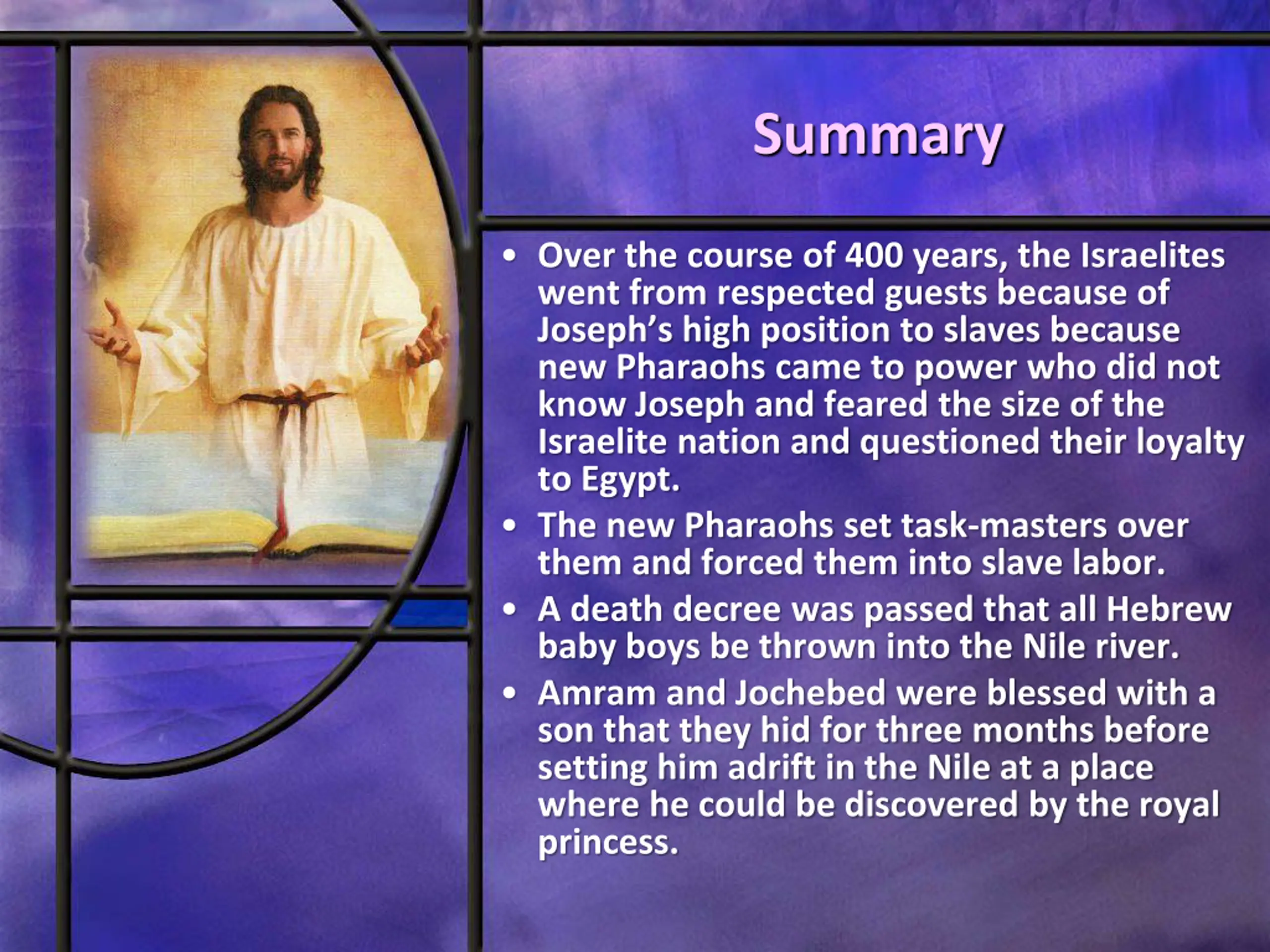Summary Over the course of 400 years, the Israelites went from respected guests because of Joseph s high position to slaves because new Pharaohs came to power who did not know Joseph and feared the size of the Israelite nation and questioned their loyalty to Egypt. The new Pharaohs set task-masters over them and forced them into slave labor. A death decree was passed that all Hebrew baby boys be thrown into the Nile river. Amram and Jochebed were blessed with a son that they hid for three months before setting him adrift in the Nile at a place where he could be discovered by the royal princess.