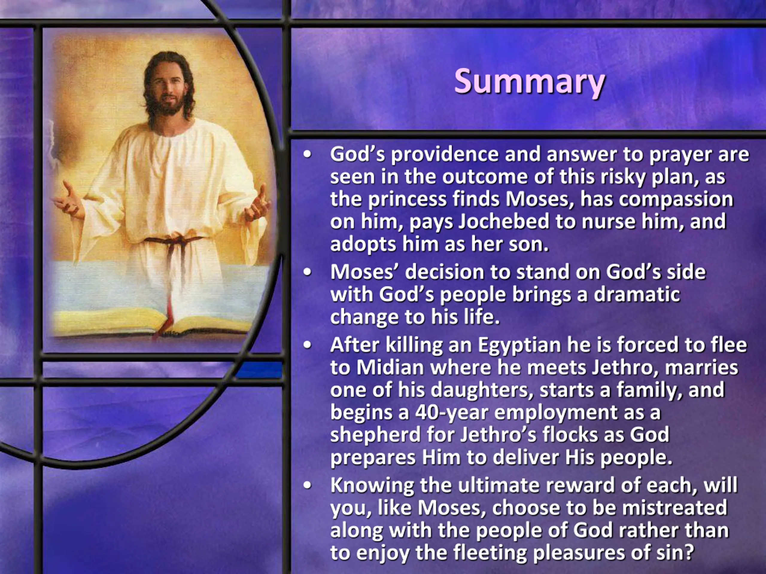 Summary God s providence and answer to prayer are seen in the outcome of this risky plan, as the princess finds Moses, has compassion on him, pays Jochebed to nurse him, and adopts him as her son. Moses decision to stand on God s side with God s people brings a dramatic change to his life. After killing an Egyptian he is forced to flee to Midian where he meets Jethro, marries one of his daughters, starts a family, and begins a 40-year employment as a shepherd for Jethro s flocks as God prepares Him to deliver His people. Knowing the ultimate reward of each, will you, like Moses, choose to be mistreated along with the people of God rather than to enjoy the fleeting pleasures of sin?
