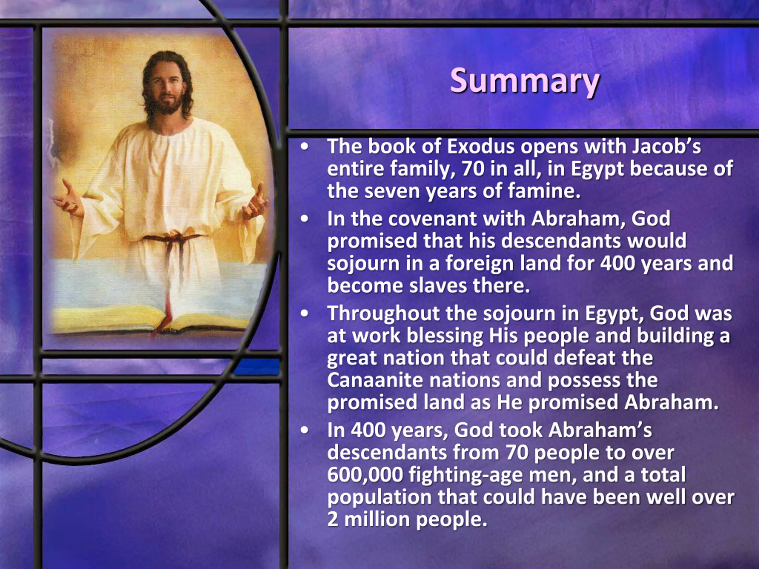 Summary The book of Exodus opens with Jacob s entire family, 70 in all, in Egypt because of the seven years of famine. In the covenant with Abraham, God promised that his descendants would sojourn in a foreign land for 400 years and become slaves there. Throughout the sojourn in Egypt, God was at work blessing His people and building a great nation that could defeat the Canaanite nations and possess the promised land as He promised Abraham. In 400 years, God took Abraham s descendants from 70 people to over 600,000 fighting-age men, and a total population that could have been well over 2 million people.
