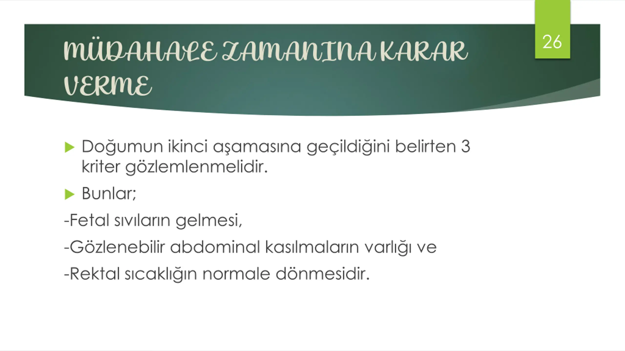 26 M DAHALE ZAMANINA KARAR VERME Do umun ikinci a amas na ge ildi ini belirten 3 kriter g zlemlenmelidir. Bunlar; -Fetal s v lar n gelmesi, -G zlenebilir abdominal kas lmalar n varl ve -Rektal s cakl n normale d nmesidir.