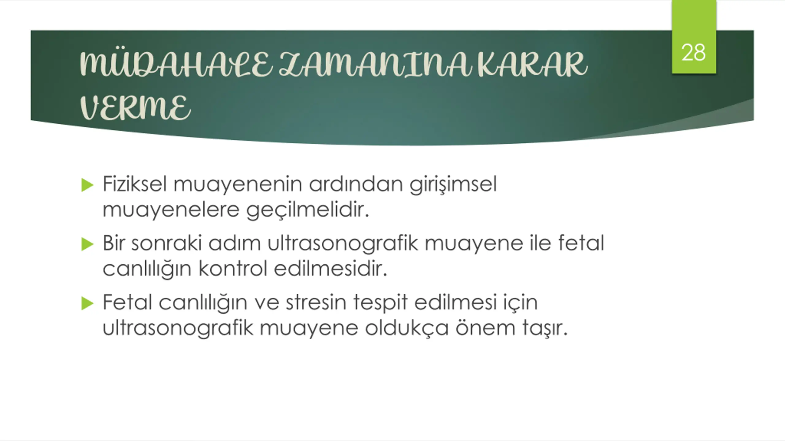 28 M DAHALE ZAMANINA KARAR VERME Fiziksel muayenenin ard ndan giri imsel muayenelere ge ilmelidir. Bir sonraki ad m ultrasonografik muayene ile fetal canl l n kontrol edilmesidir. Fetal canl l n ve stresin tespit edilmesi i in ultrasonografik muayene olduk a nem ta r.