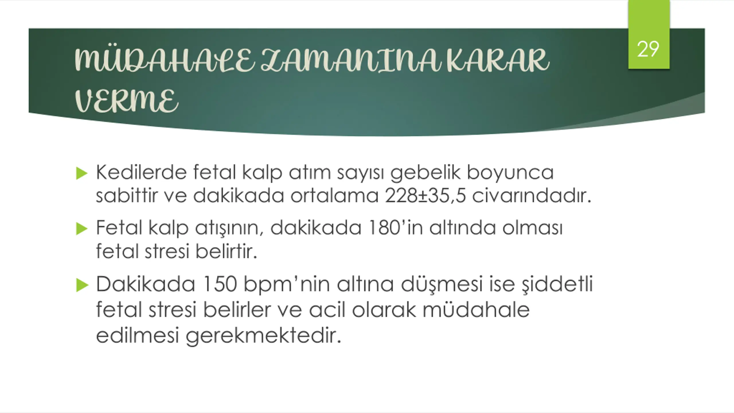 29 M DAHALE ZAMANINA KARAR VERME Kedilerde fetal kalp at m say s gebelik boyunca sabittir ve dakikada ortalama 228 35,5 civar ndad r. Fetal kalp at n n, dakikada 180 in alt nda olmas fetal stresi belirtir. Dakikada 150 bpm nin alt na d mesi ise iddetli fetal stresi belirler ve acil olarak m dahale edilmesi gerekmektedir.