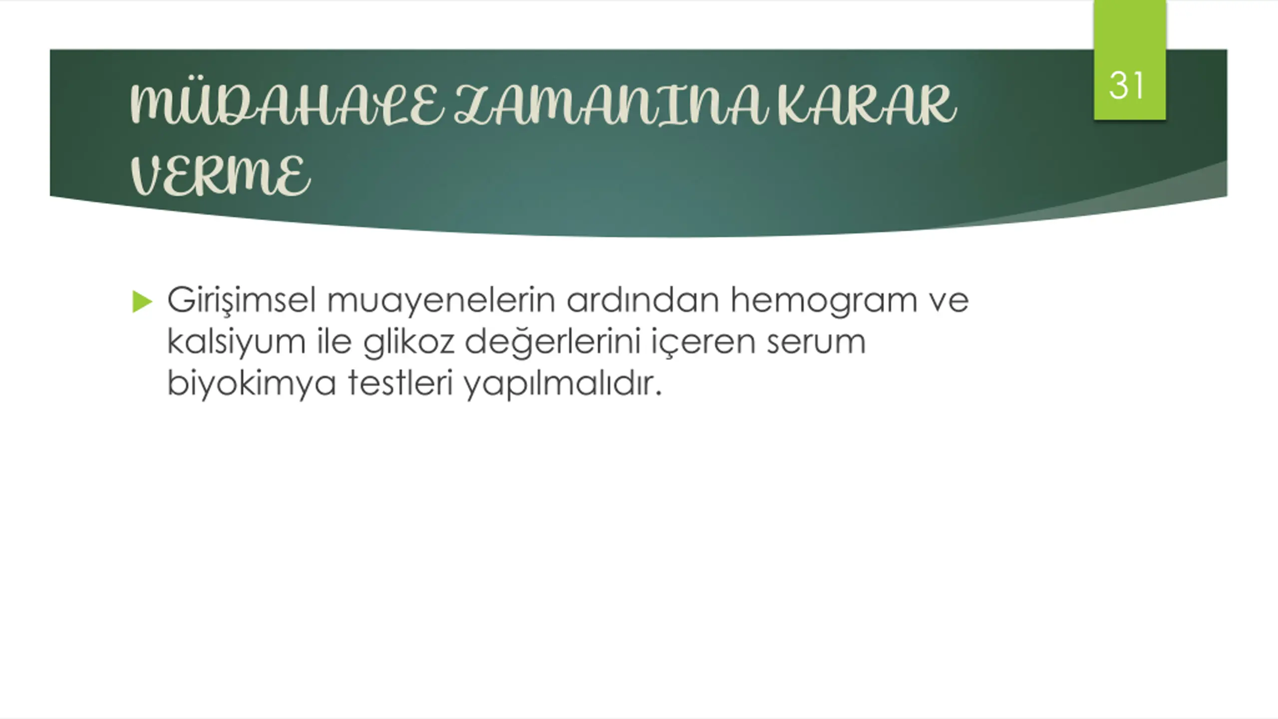 31 M DAHALE ZAMANINA KARAR VERME Giri imsel muayenelerin ard ndan hemogram ve kalsiyum ile glikoz de erlerini i eren serum biyokimya testleri yap lmal d r.