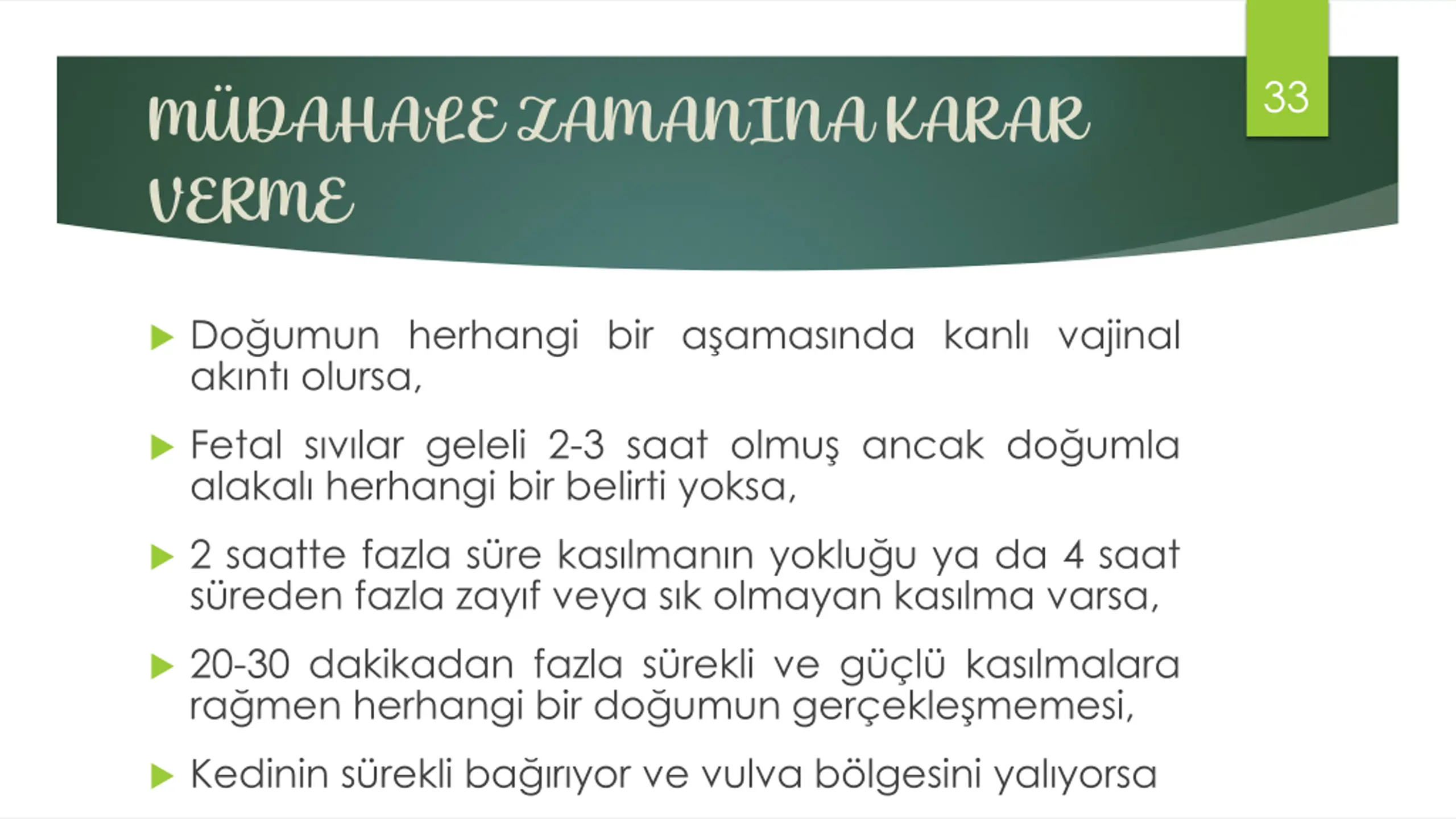 33 M DAHALE ZAMANINA KARAR VERME Do umun herhangi bir a amas nda kanl vajinal ak nt olursa, Fetal s v lar geleli 2-3 saat olmu ancak do umla alakal herhangi bir belirti yoksa, 2 saatte fazla s re kas lman n yoklu u ya da 4 saat s reden fazla zay f veya s k olmayan kas lma varsa, 20-30 dakikadan fazla s rekli ve g l kas lmalara ra men herhangi bir do umun ger ekle memesi, Kedinin s rekli ba r yor ve vulva b lgesini yal yorsa